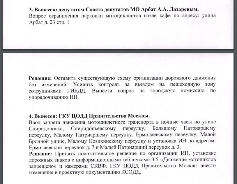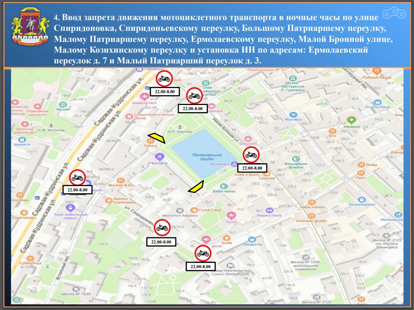 Соответствующий подзаконный акт был принят комиссией по безопасности дорожного движения при префектуре ЦАО г. Москвы по инициативе ГКУ ЦОДД Правительства Москвы. Было решено запретить движение мотоциклов по Малому Козихинскому, Спиридоньевскому, Ермолаевскому, Большому и Малому Патриаршьим переулкам, а также по улицам Малая Бронная и Спиридоновка. Въезд двухколёсной технике будет заказан в ночные часы, а точнее - с 22 до 8.
