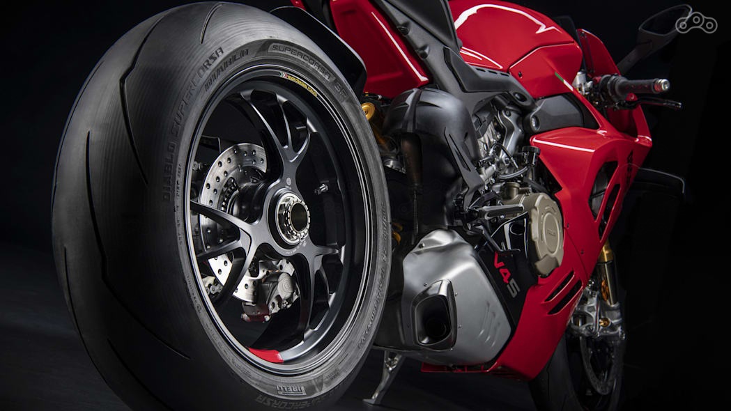 Стандартный Panigale V4 будет комплектоваться вилкой Showa Big Piston Fork и амортизатором Sachs, V4 S – компонентами Ohlins, на обоих мотоциклах ось маятника была перенесена на 5 миллиметров вверх. У V4 – литые десятиспицевые алюминиевые колёсные диски, у V4 S – девятиспицевые кованые.