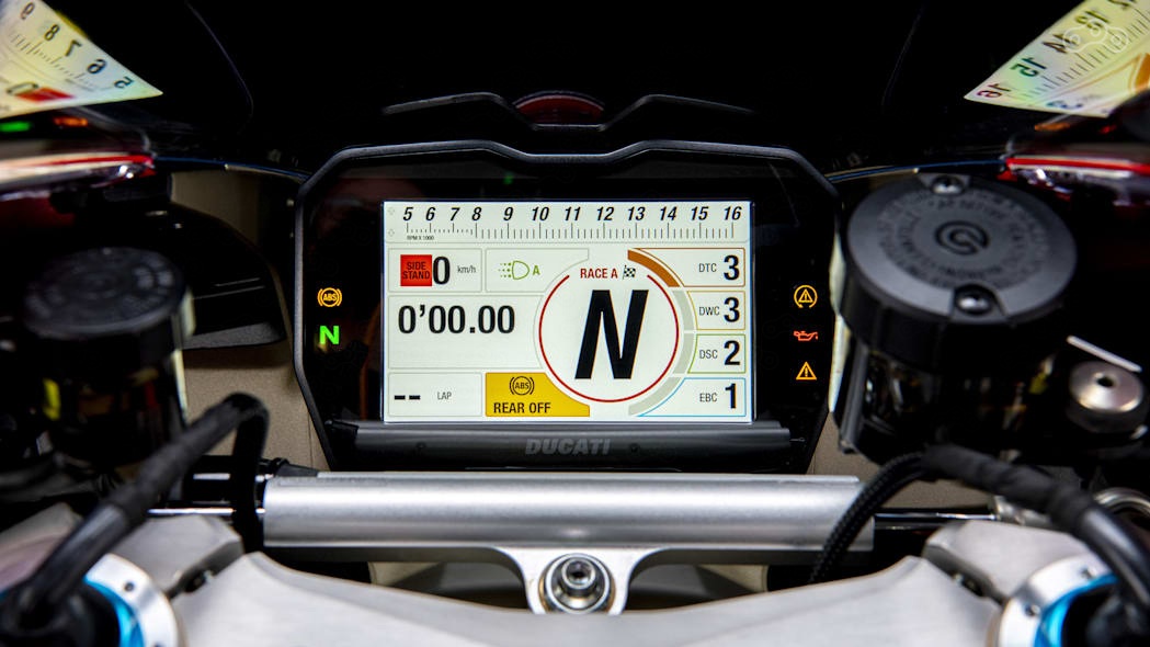 5-дюймовая приборная панель Panigale V4 и V4 S стала информативнее. Тахометр в режиме Track Evo теперь представлен в виде горизонтальной полосы в верхней части экрана. Индикатор необходимости смены передачи слева вверху стал более читаемым, а номер передачи теперь расположен в верхнем правом углу дисплея.
