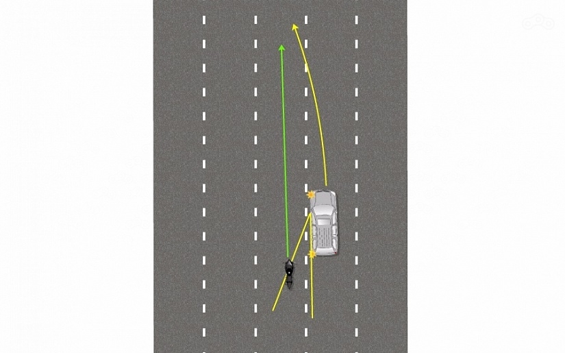 Если вы глянули схему, то увидели, что я (ну да, тут спортбайк, но в конструкторе нет моего мотоцикла) фарой выпал из поля зрения зеркала Лексуса, но ещё не въехал в его поле зрения в окне. Поэтому он и начинает совершать манёвр. Он был уверен, что там никого нет.