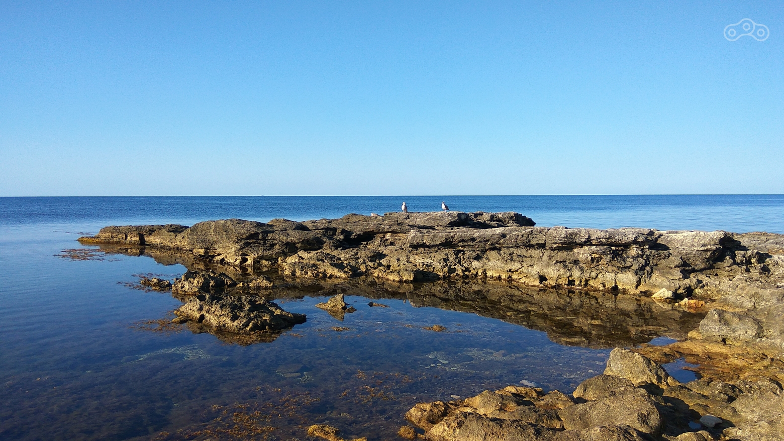 Море спокойное. Тишина. Лишь изредка слышится гулкое бульканье, когда вода заполняет пустоты скалистого берега.