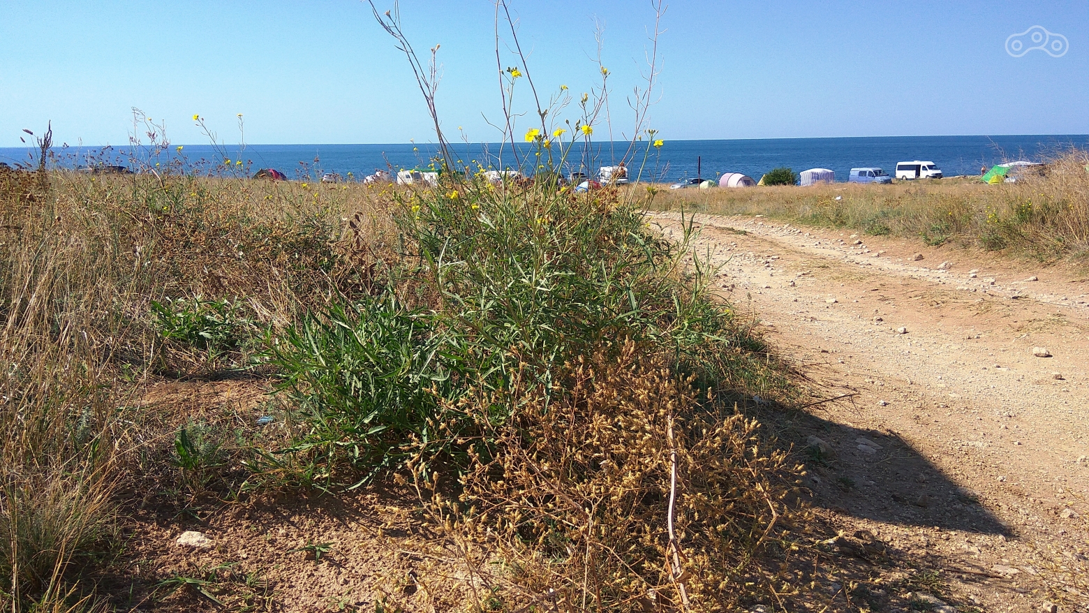 Доехав до Малого Атлеша, мы поняли, почему движение такое оживленное. Ведь именно здесь расположился огромный палаточный городок. В летний сезон, особенно в выходные дни, люди компаниями выезжают на Тарханкут пожарить шашлыки, попеть песни у костра, накупаться, да просто хорошо отдохнуть. Очень плотно расположились импровизированные лагеря. Можно сказать, на головах друг у друга.