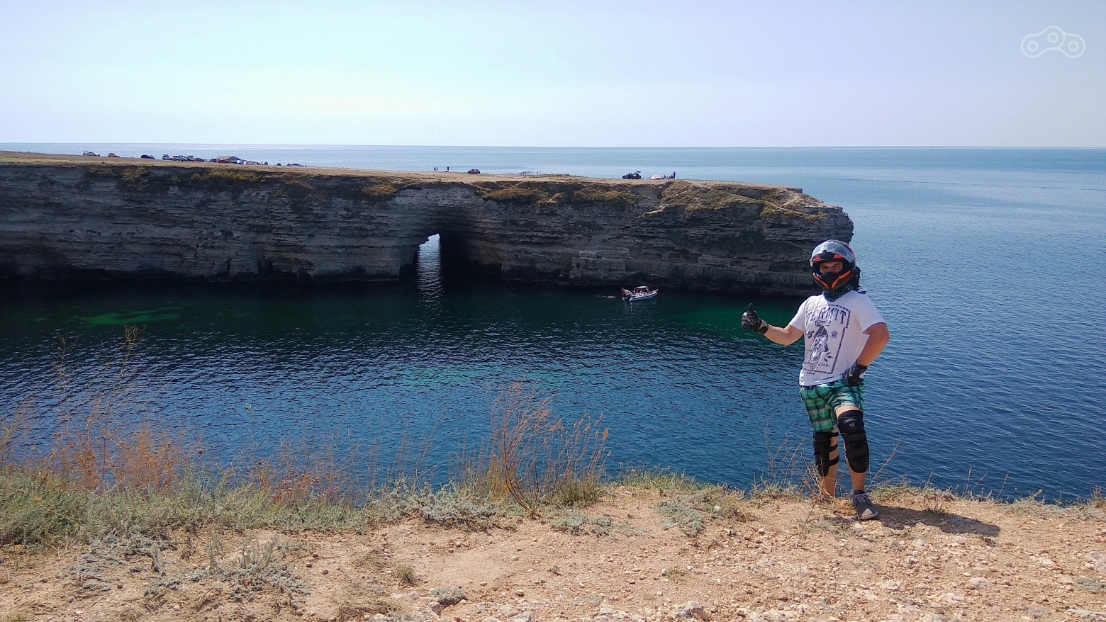 Здесь же мы познакомились с мотоциклистом на Stells 400 из Бахчисарая, который приехал в этот дикий край со своим сыном, чтобы показать ему эти необычно красивые места. Поделились впечатлениями о Тарханкуте, обсудили мотоциклы. Он рассказал нам об интересных местах в центральной части Крымского полуострова, куда они выезжают с друзьями на выходные, посоветовал несколько точек в Большом Каньоне, где можно комфортно переночевать с палаткой. Но об этом поподробнее мы напишем в следующей части нашего отчета.