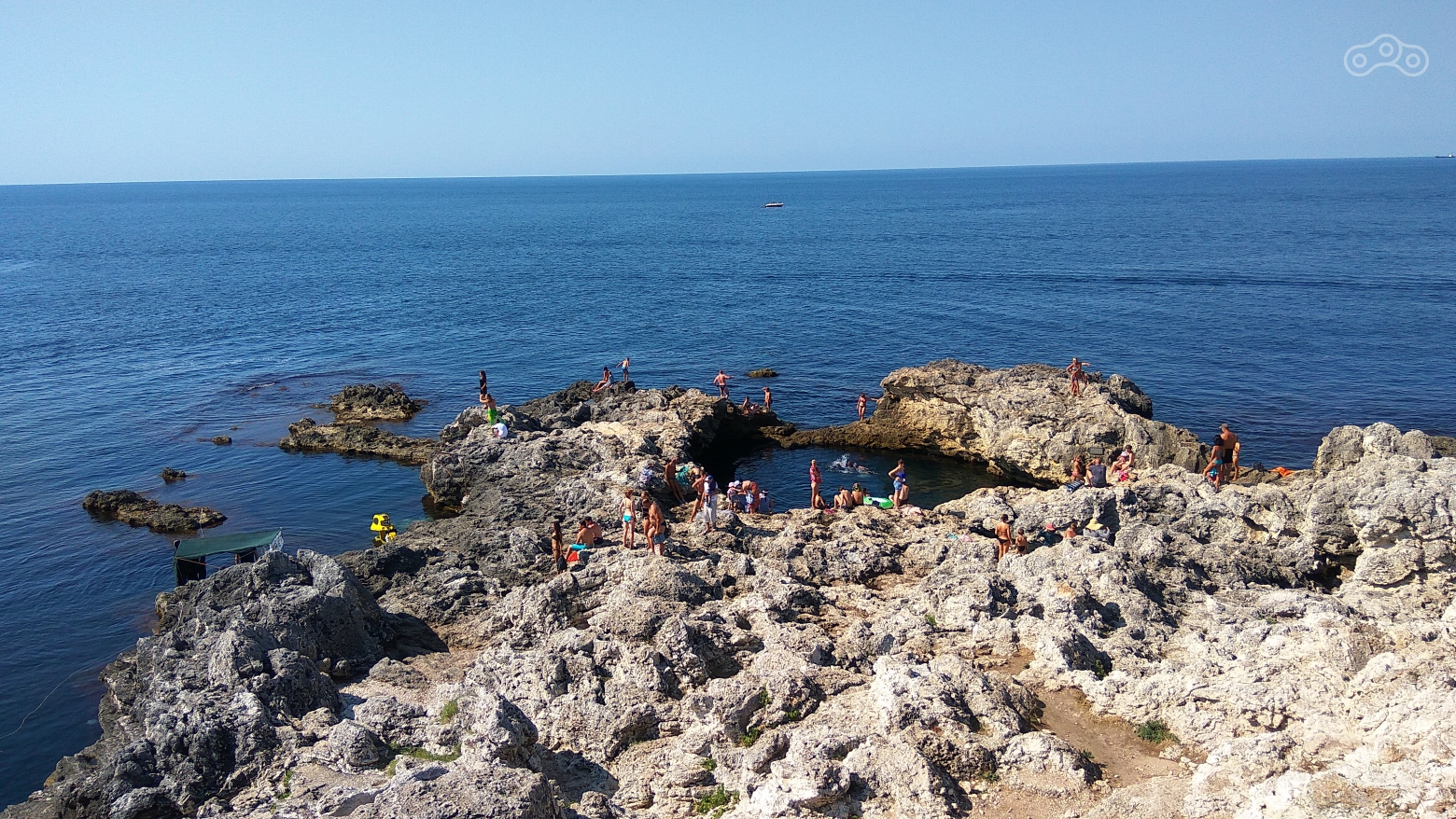 Из-за неприступности моря в этих местах, благодаря высоким обрывам, мест для купания реально не так много, как самого моря до горизонта. Как следствие, на этих немногочисленных спусках к воде собирается столько народу, как говорится, яблоку негде упасть. Знаете, вспоминается картинка из демотиваторов с китайским пляжем, где на берегу все сидят плотничком, а в воде стоят плечом к плечу. Ну вы понимаете, о чём мы. Тут примерно так же. Ну вот совсем на капелюшечку получше.