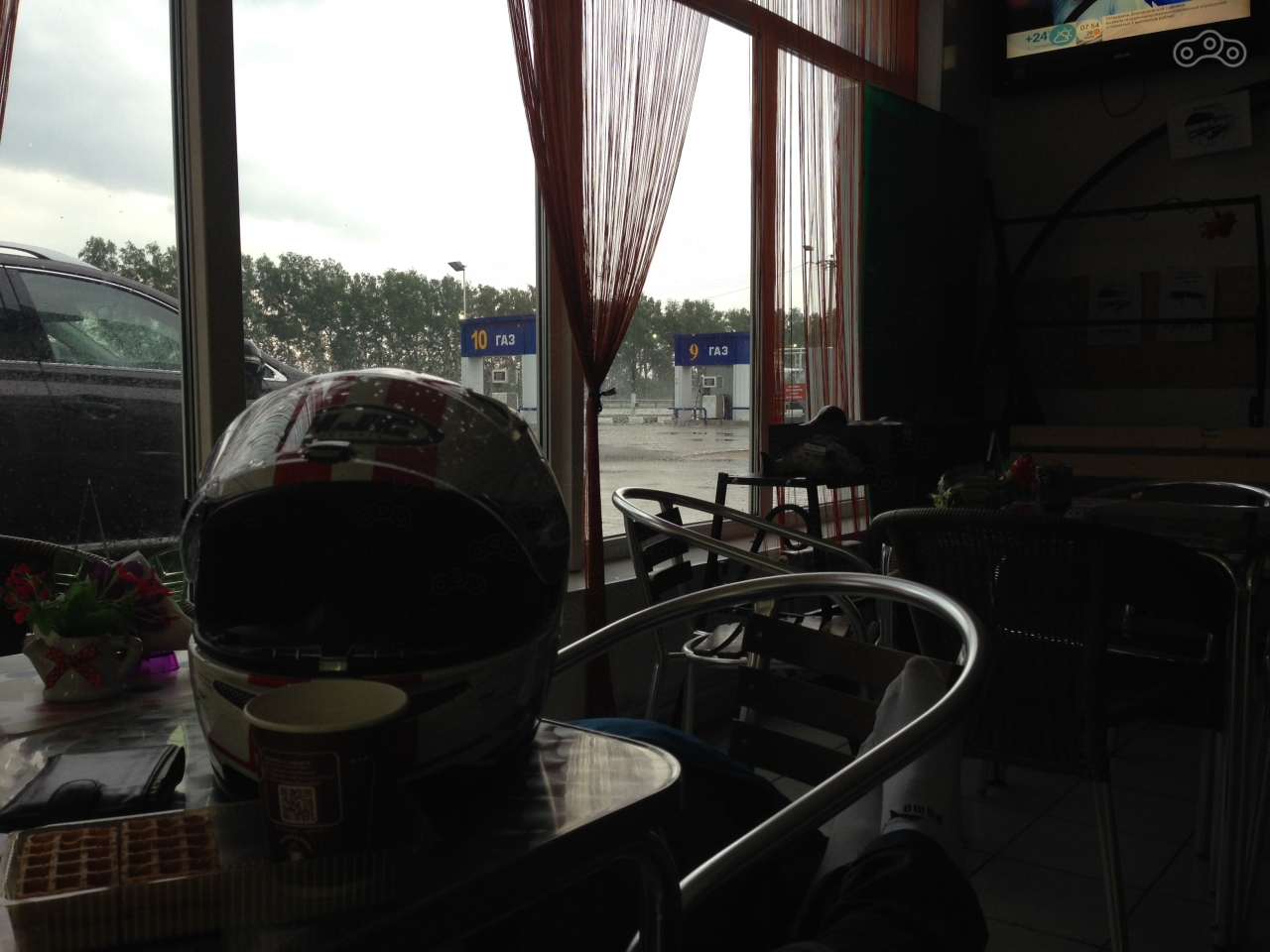 Ладно, выехал их города без проблем (еще бы, только 6 утра!), поехал по М4, тут рассказывать особо не про что, все по ней ездили, все всё знают, и не раз описывали и ее красоты, и состояние и проч. Где-то после TOOL PLAZA (кстати у меня всегда вызывало недоумение — как мотоциклисты умудряются платить на платницах Росавтодора, или того хлеще покупают транспондер? Я не отдал ни рубля за всю дорогу, и проезжал все шлагбаумы сухо и комфортно), на выезде из области, увидел стремительно надвигающуюся тучу, которая по сведениям Яндекса должна быть не такой стремительной, и мы должны были встретится только у Ефремова). Проезжаю еще чутка, и резко попадаю в ливень, проехал под ним километра два, и остановился на Эльф-ойл (там еще на противоположной стороне деревянная часовенка и мотель сруб). Стало немного обидно, потому что было только 7:20, а я взял хороший темп - проехал около ста сорока километров (с учетом выезда из центра города) за час двадцать.