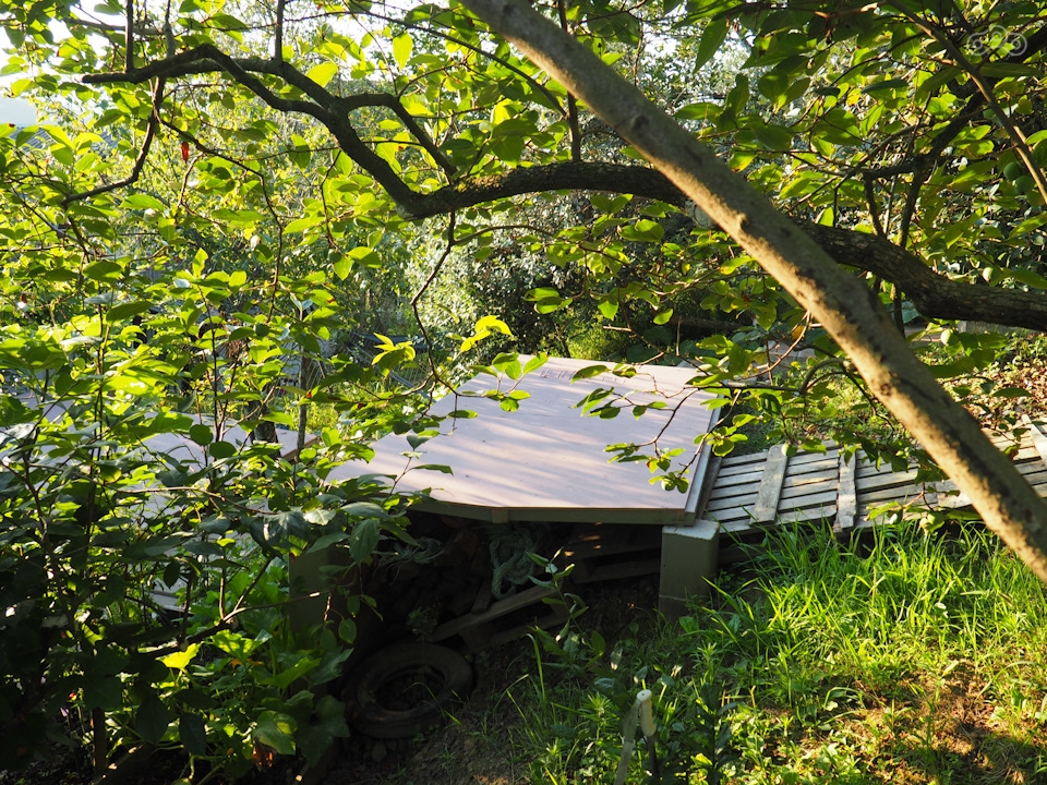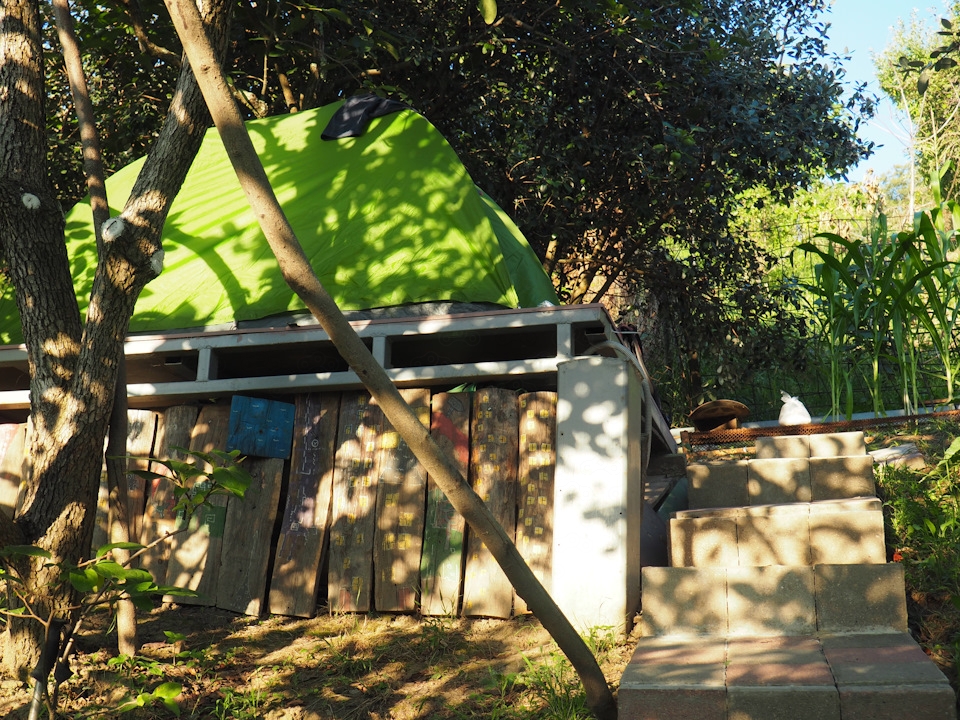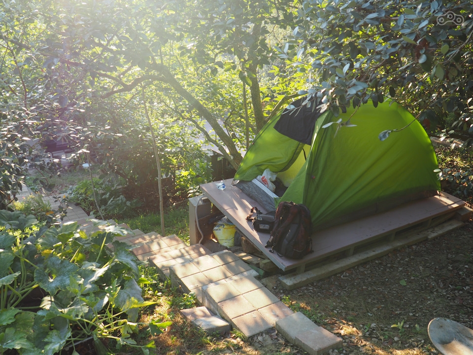 Закатываю мотоцикл во дворик и иду за Глебом за домик . А там на склоне горы под деревьями фейхоа и хурмы стоят помосты под палатки . С освещением, розетками . Внизу у дома веранда с мангалом и кухней . Ниже душ с горячей водой и туалет . Плюсом тёплый домашний приём .