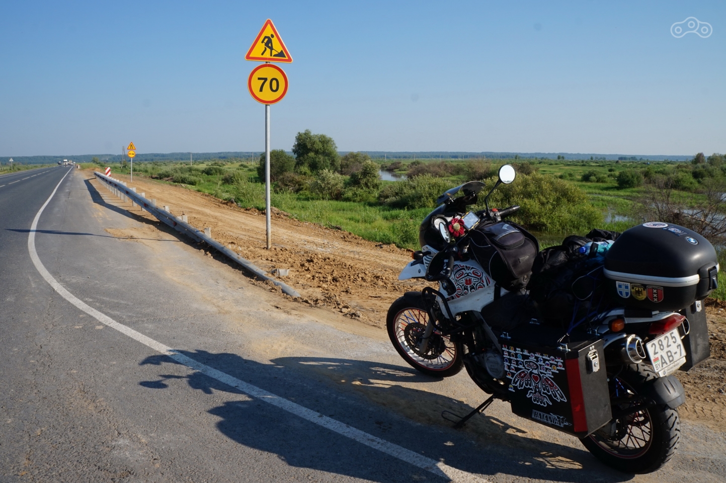 Выехала очень рано – надо наверстать вчерашние 300 км. Везде стелится плотный туман, дорога становится хуже, на ухабах из сумки на баке вылетает телефон. Быстро останавливаюсь, бегу обратно искать. Немного поцарапан, отколот кусочек, но работает. Еду вперед.