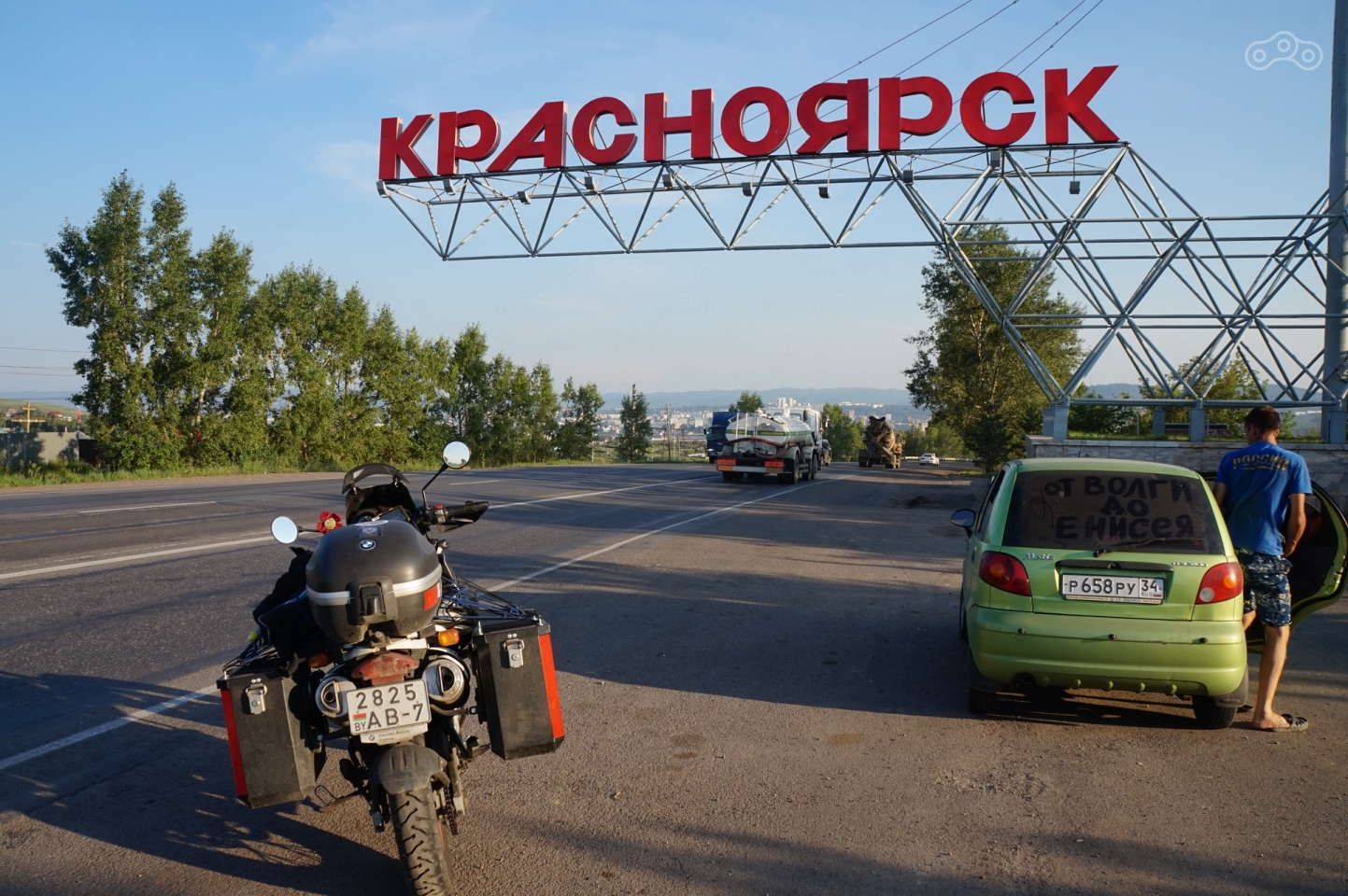 Россия начинает укутывать своей душевностью, простотой. Отдельно хочется сказать про названия – они потрясающие! Я встречала деревни Хомячки, Чертов кулич, Клубничный, Веселая и много-много других. Незаметно пролетели 800 км до Красноярска. Здесь встречаюсь с Кириллом, у которого уже остановился питерский путешественник Димка. У нас с ним у обоих есть значки «Слабоумие и отвага» - у меня на мотоцикле, у него на куртке. И мы естественно решили подтвердить эти звания, решив полезть посмотреть на Красноярские столбы поздно вечером, так как на подъемники мы опоздали. Я в платье, без фонариков, не имея ни малейшего понятия, как туда добраться ползем вверх по сопке. Крапива, какое-то болото, камни, а на самом верху непролазная чаща. Сели, отдохнули, решили, что дальше не пройдем и пошли обратно, довольные и счастливые. Зато спалось хорошо, мертвым сном после такой физ. разминки.