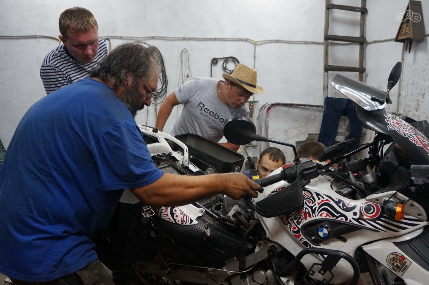 Решаем ехать до Слюдянки и искать там автомагазин. За 3 минуты до закрытия Александр покупает тормозной шланг от Жигулей! Бинго! Вот это удача! Связываемся с Женей «Чемпионом» из Улан-Удэ, он как раз оказался в Слюдянке в этот день, он отправляет к нам ребят на помощь. Нас забирают и провожают в гараж. У одного из парней - Ильи – день рождения, парни планировали отмечать на Байкале, а вместо этого поехали с нами в гараж чинить моего любимого Генри. Несколько часов дядя Саша с Андреем что-то режут, обжигают, плавят, мастерят и вуаля – Генри снова тормозит! Конструкция великолепна и мой гусь уже не совсем немецкий, обрастает российскими частями – в Елабуге - трубка от Камаза, теперь – шланг от Жигулей.