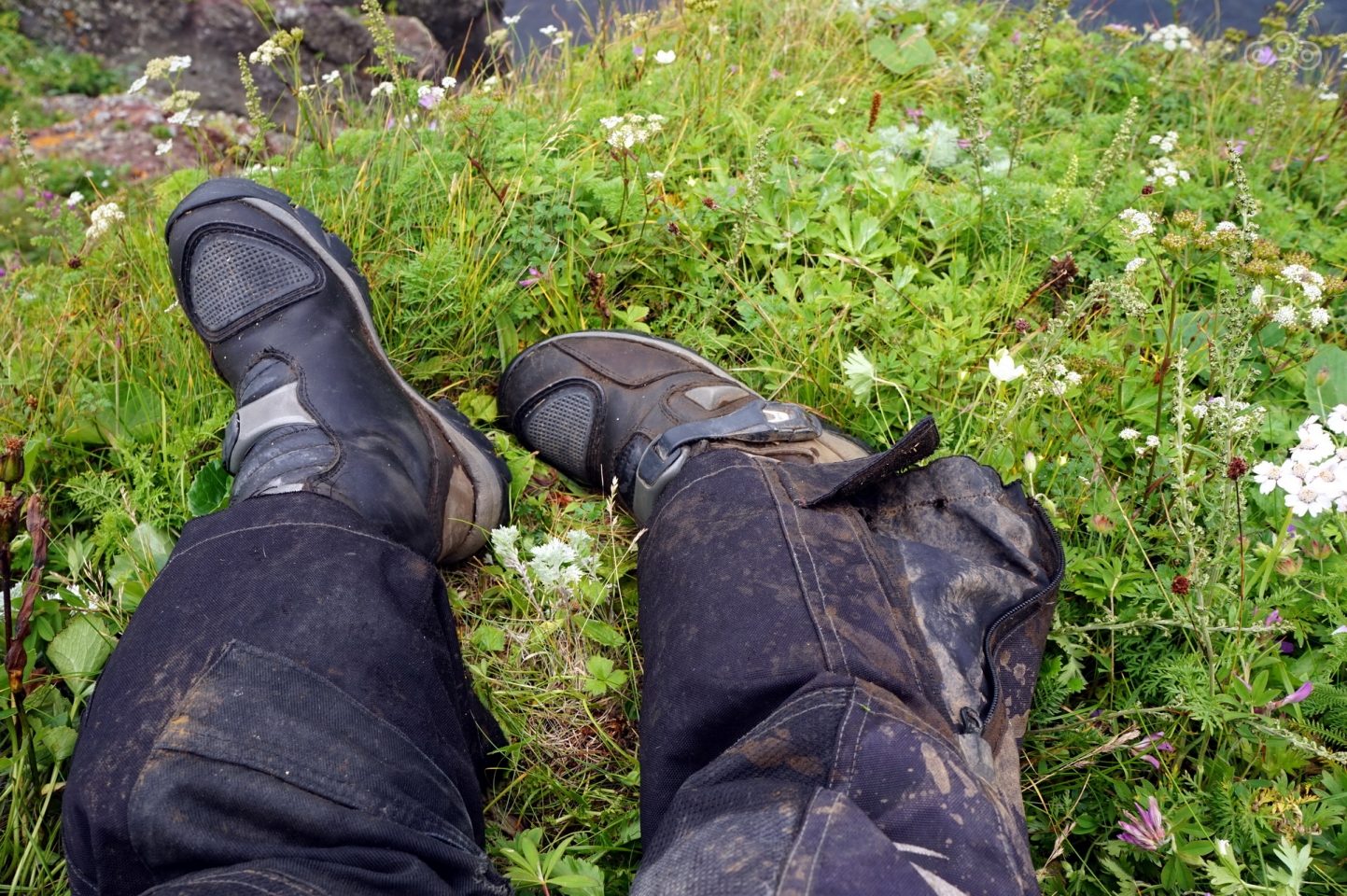 Их было еще несколько, но запомнилась та, которая текла по дороге. Или это люди проложили дорогу по реке. Один из самых сложных участков, мелкие скользкие камни и руль выбивает из рук, я вся мокрая под черепахой – то ли от ледяных брызг, то ли от работы мышц, а может и всё вместе. Выезжаем на берег Тихого океана. На адреналине я уже не боюсь даже песок и помогая ногами подползаю на мотоцикле ближе к воде. Здесь можно немного отдохнуть и я уже вижу его – Мой КРАЙ СВЕТА. Только отдыхать не хочется, ехать ехать, всё равно как, но вперед.