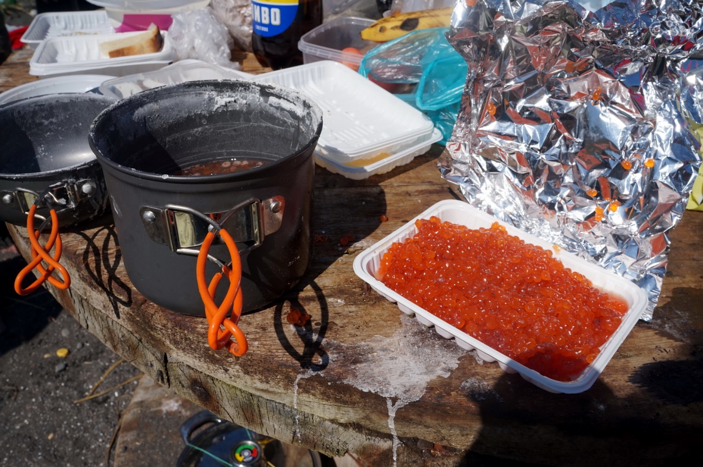 Ребята ловко вспарывают рыбам брюхо и у нас 3 девчонки с икрой! Вот это удача! Соленая морская вода кипятится на костре, затем туда высыпают икру и вуаля – готова знаменитая «Икра-пятиминутка». Вкуснее я в жизни не ела! Сочная, крупная, даже хлеб к ней не нужен.