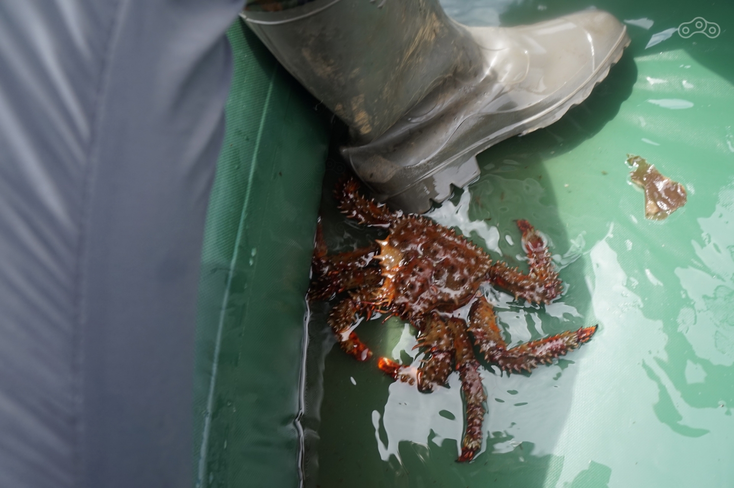 Обходим на веслах Край света со стороны Тихого океана, начинает сносить волнами, надо вернуться. Пока катались, в краболовку уже попали 2 первых краба, а в сетях уже 4 горбуши!