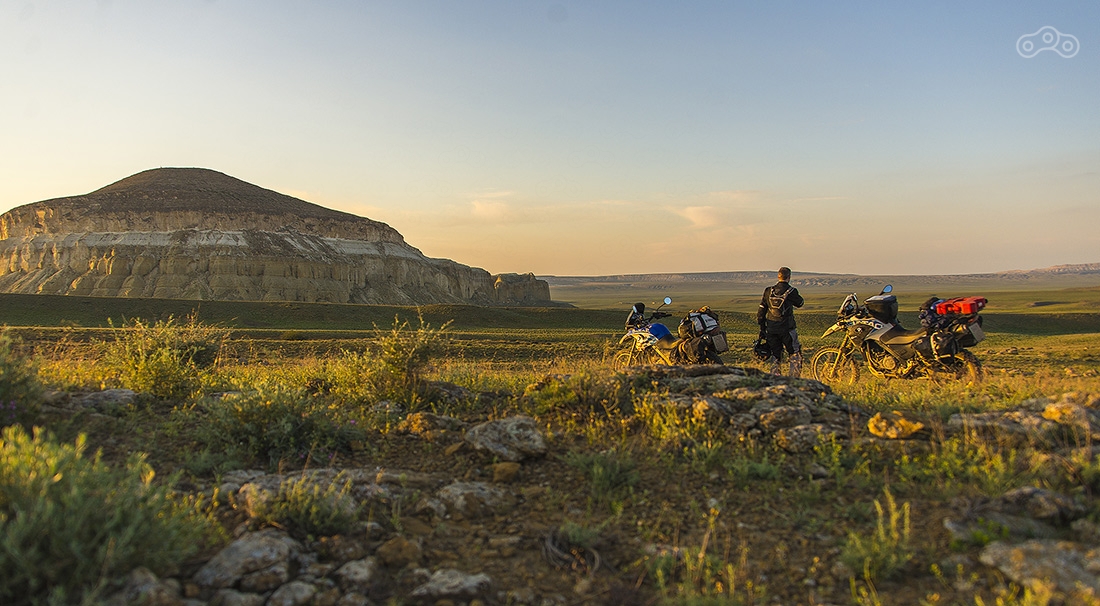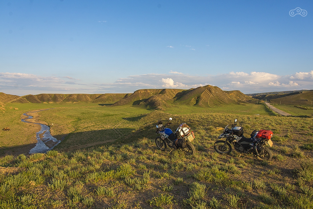 На закате возвращаемся в первую точку, откуда открывается самый фантастический вид и разбиваем здесь лагерь. Вечером сюда приезжает еще два мотоциклиста из Москвы (привет Ивану и Ярику). Иван учит нас теории управления мотоциклом на бездорожье :) и на следующий день нам это сильно пригодилось.