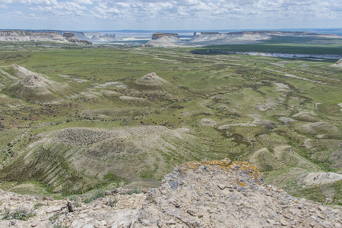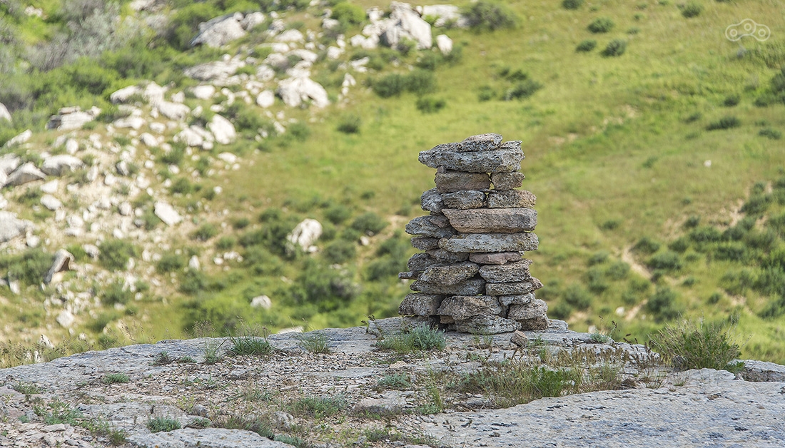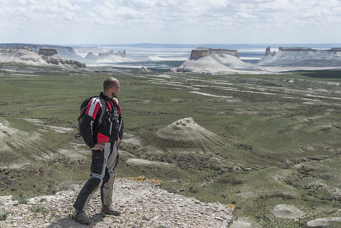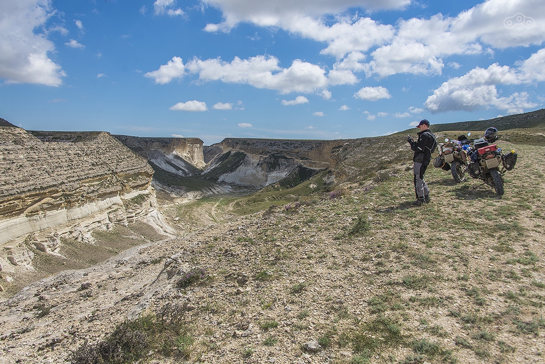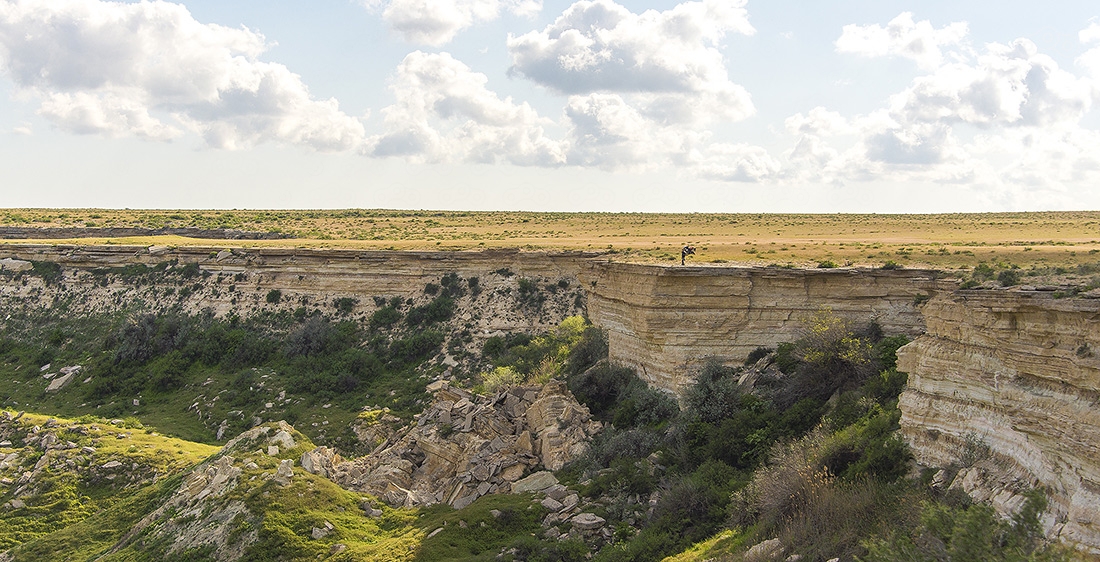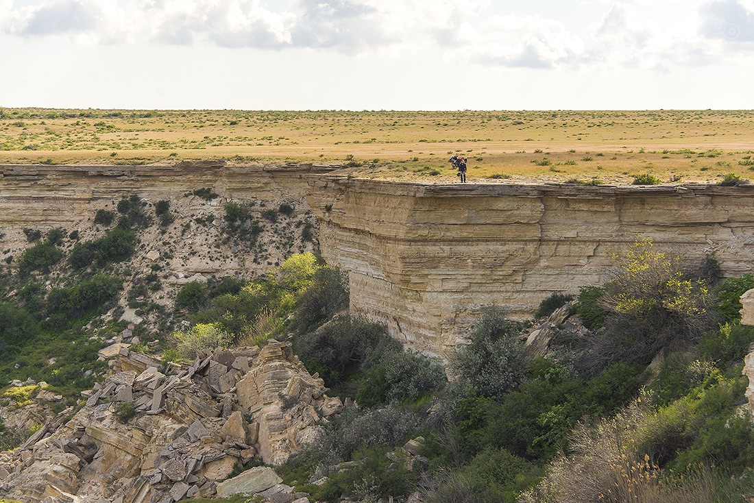 Все это время вокруг была только степь — ровная и бесконечная, но оказалось, что все это плато, высота которого постепенно росла. Здесь та точка, где вид резко изменился. Пять минут назад была степь, а тут бац — и сразу горы. Это очень старые меловые горы, которые легко осыпаются, поэтому здесь никакого скалолазания быть не может. Еще там можно найти окаменелости древних морских животных, которые тут жили, когда все это было под водой.
