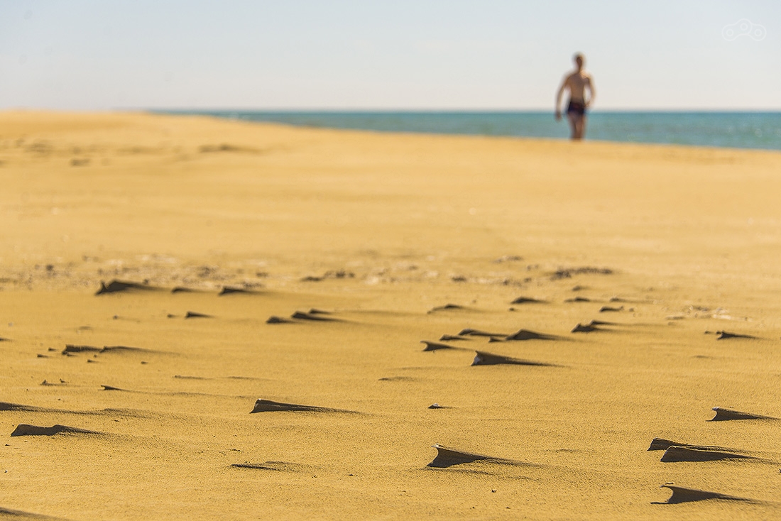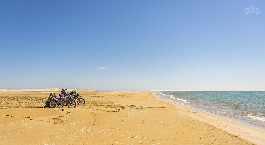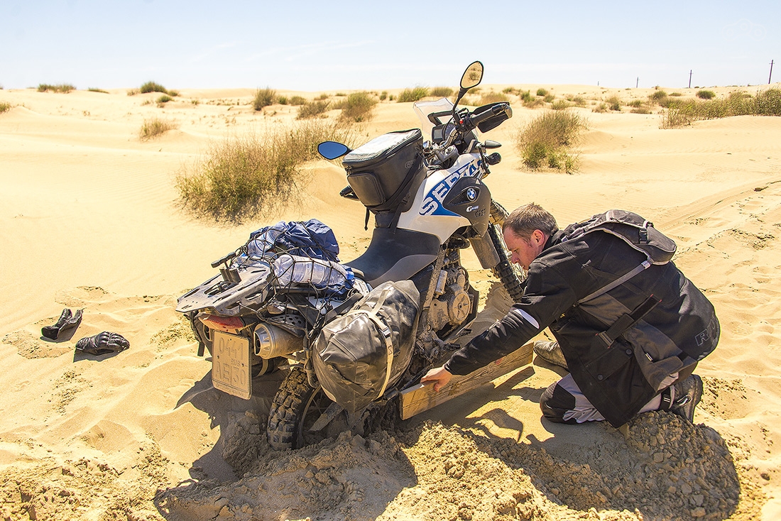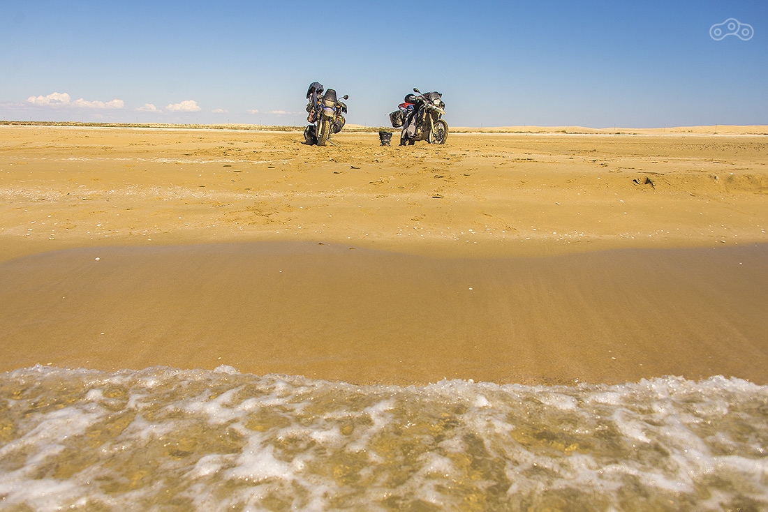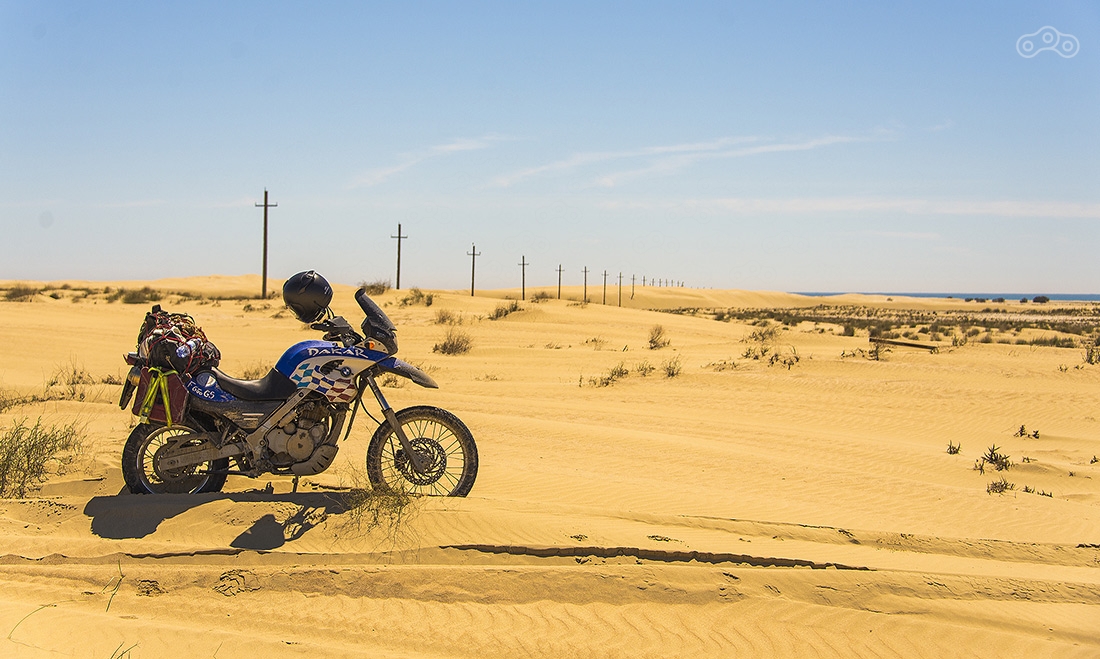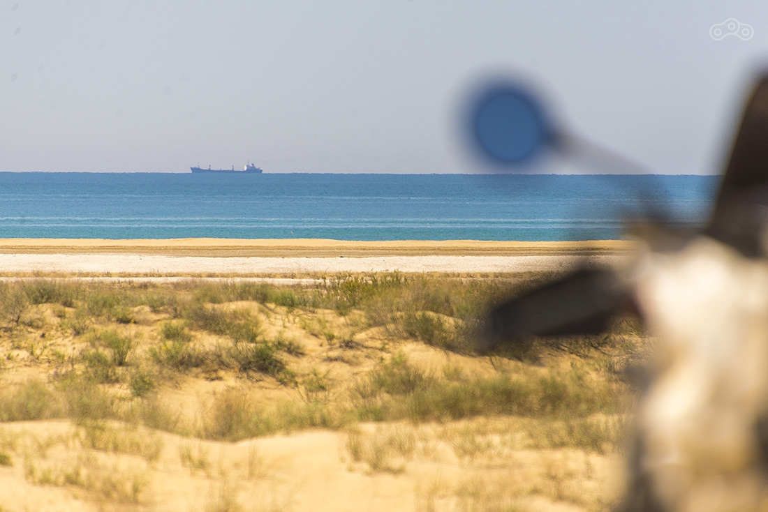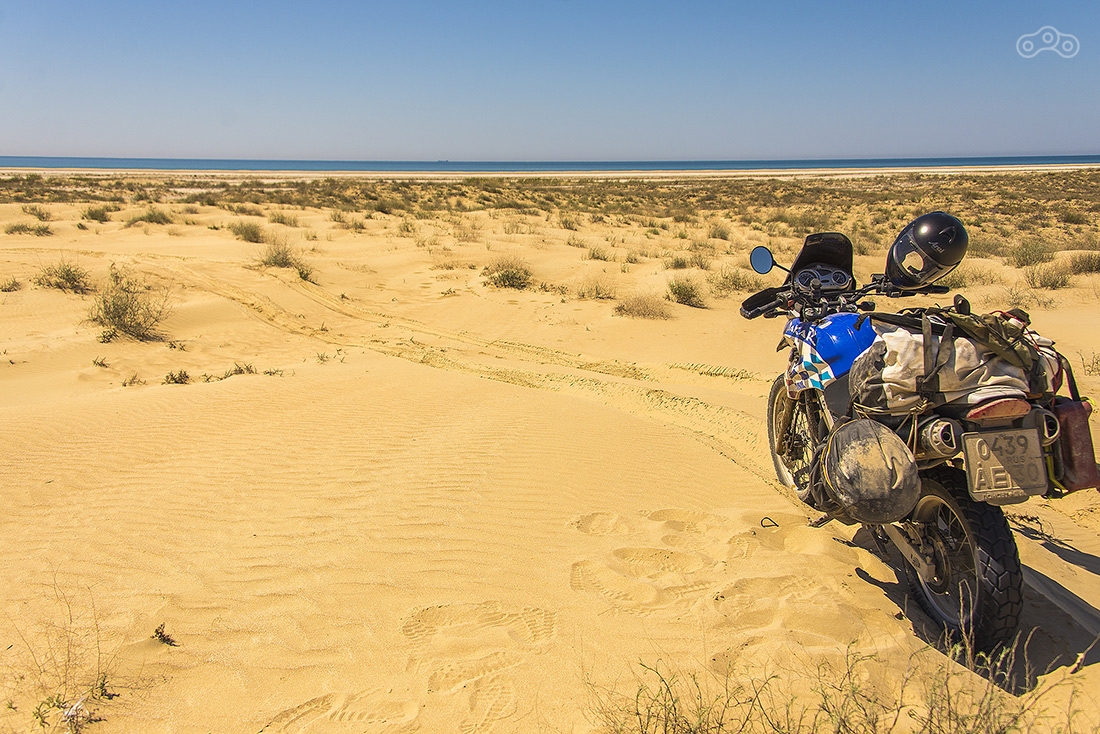 Дорога на мыс Песчаный оказалась непростой задачей. Сначала долгая грунтовка по изнуряющей жаре, а потом непроходимый песок. До этого мы катались по песку, но здесь он оказался настолько топким, что мотоцикл просто сразу закапывался. Мы потеряли где-то час, прежде, чем достигли берега Каспия.