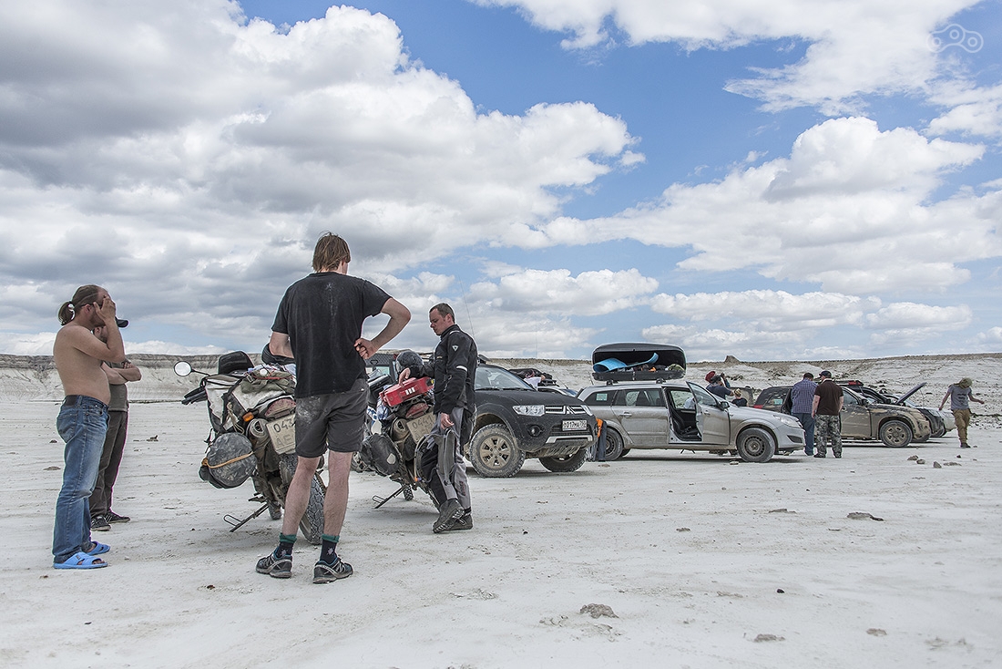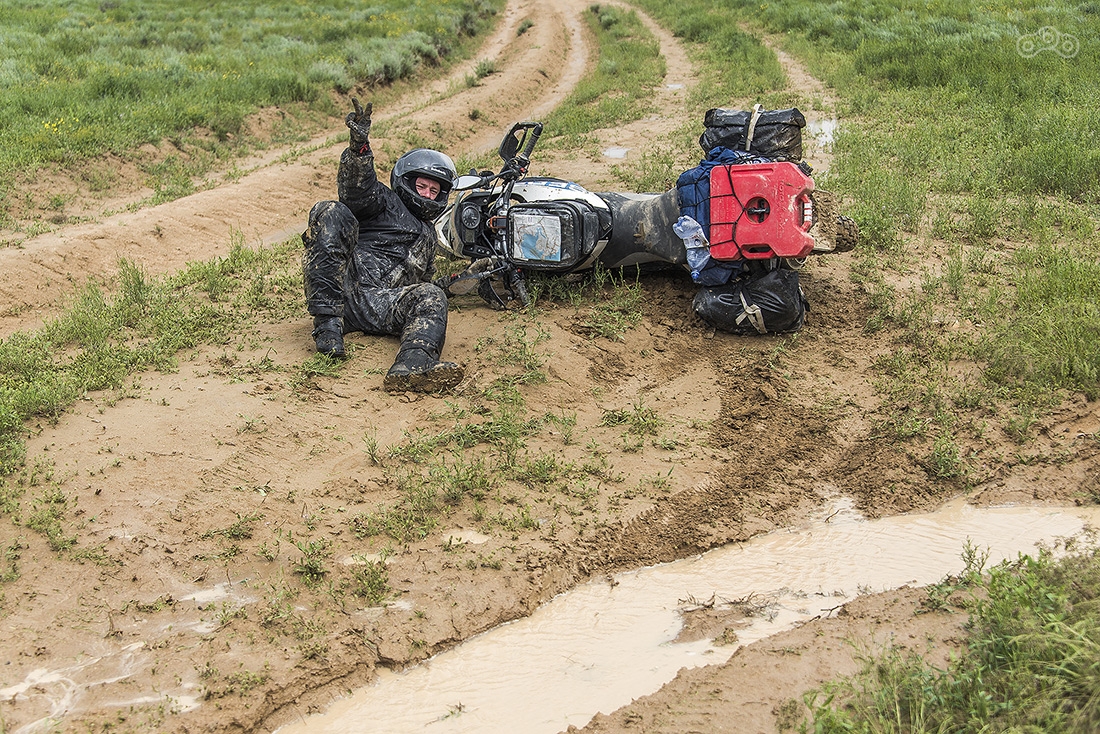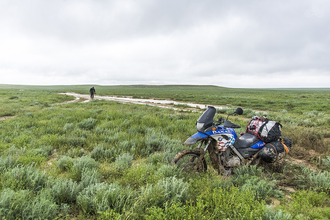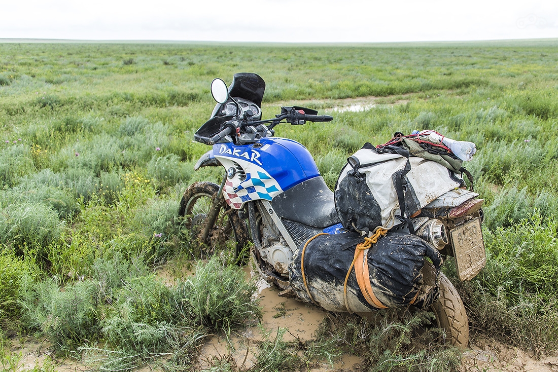 Выезжаем утром, но уже идет дождь, а в степи, которую нам предстоит пересечь он шел и раньше, поэтому ее размыло в болото. Отсюда у нас, к сожалению, всего пара фотографий, здесь было не до этого. 100 км степи мы ехали где-то 9 часов... За это время мы потеряли счет своим падениям, несколько раз наглухо застряли. И все это на фоне заканчивающегося бензина.
