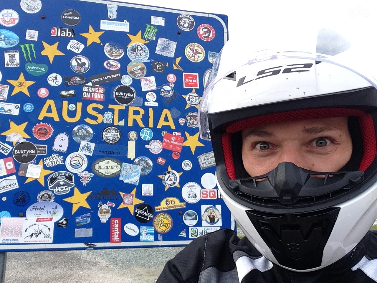 А в Чехии меня конкретно залило дождём, сильно и долго! Тонкая куртка не спасла, а дождевик я не успел купить. Зато в Австрии сразу стало теплее и я сушился встречным потоком. Но в сапогах вода так и стояла по край, пришлось переобуться в кеды и сапоги привязать сзади, с них ещё долго капало, как из крана. Так и въехал в столицу Австрии...
