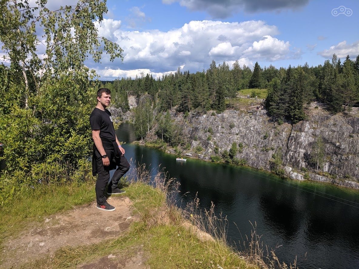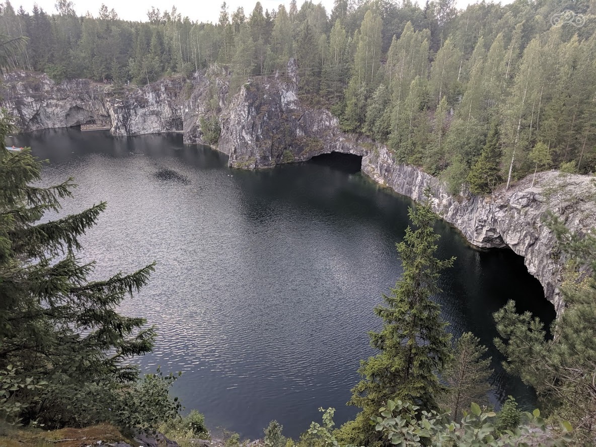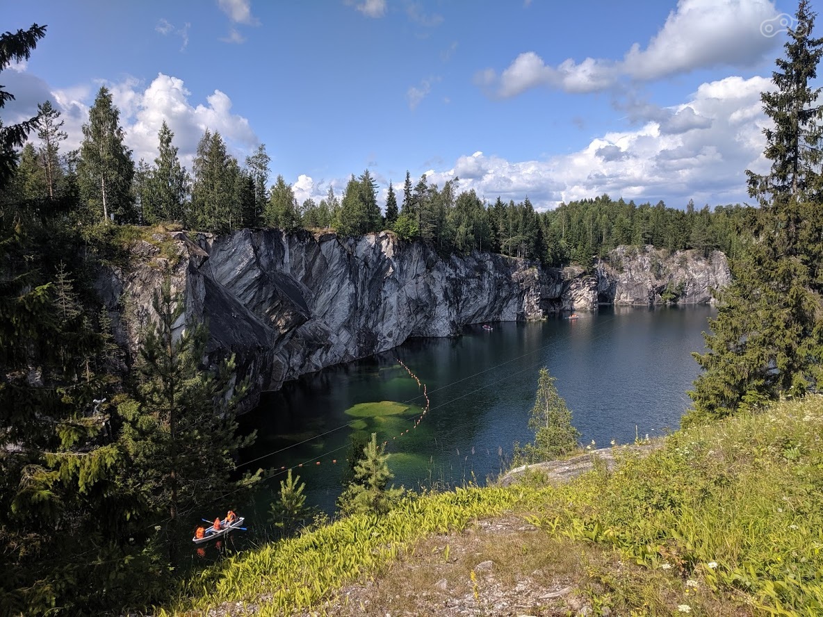 Простившись с водопадами, мы двинулись к следующей точке путешествия - горный парк Рускеала. Масштаб в разы больше предыдущего парка, включающий не только группу озер, но и различные аттракционы: пролет вдоль всего озера на канате, экскурсия на лодках в гроты, прыжки с обрыва.