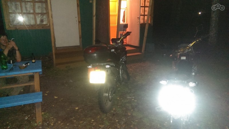 Но мы же на холме, сейчас как разгонимся и заведем с толкача. Первая попытка результата не принесла, вторая тоже. Побегав еще немного туда-сюда с нагруженным мотоциклом и изрядно вспотев, мы начали понимать, что дело было не в бензине. Сев отдышаться, я начал лихорадочно вспоминать любые причины, прочитанные мной на форуме, по которым мотоцикл может на заводиться. Перво-наперво было решено проверить регулировки карбюратора. Поскольку мотаки у нас одинаковые, а свой я отстроил как с иголочки, я точно знал, как надо накрутить карбюратор для идеальной смеси. Сказано ....., а чем сделать то? Весь инструмент оказался похороненным на самое дно кофра, который в свою очередь был погребён под грудой рюкзака, палатки и т.д. Вытаскивать долго, да и сил после забега с мотоциклом уже немного. Где-то в верхней части своего рюкзака Лёша нашел лампочку для головного света, её то и было принято решение использовать в качестве отвертки. После недолгих мучений с регулировкой лампочкой карбюратора, были предприняты очередные попытки завести злосчастный двигатель. Со стороны это, наверное, выглядело как аттракцион "потолкай друга на мотоцикле". Двигатель попёрдывал, пыхтел и иногда даже схватывал, но заводиться упорно не хотел. К тому моменту солнце уже село и мир вокруг нас погрузился во тьму, только огни заправки помогали нам. Вспомнив что писали на форуме, я предположил, что поплавок в карбюраторе закис и бензин переливает. Мы решили слить бензин из карбюратора и попытаться завестись снова. О чудо, проделав сие и потолкав его еще немного, двигатель завелся. Но работала эта зараза только на полном газу. Как только газ отпускали, он глох и аттракцион повторялся заново. Я же был мокрый от пота насквозь, с моей мотокуртки буквально капало.