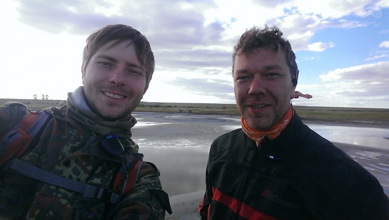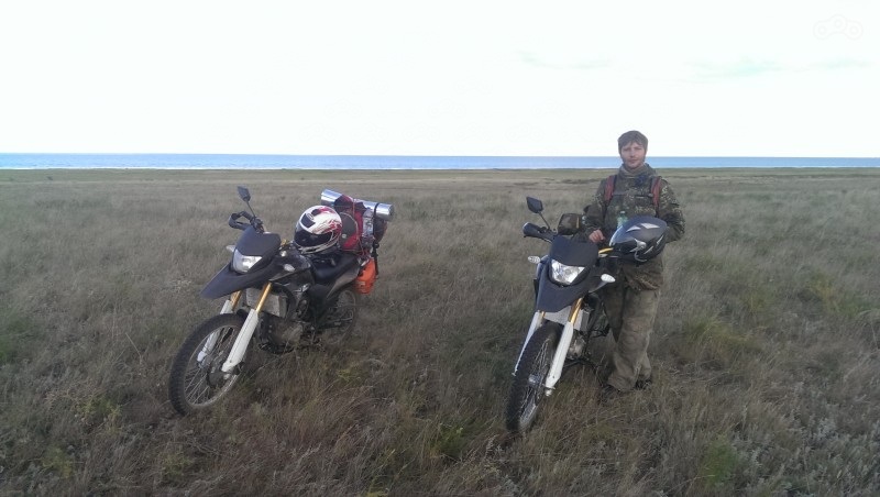 Пройдя половину оставшегося пути, на подъезде к Хабарам, решили, что едем мы быстро и вполне успеваем сделать небольшой крюк и взглянуть на озеро Кулундинское. Тем более, что это была основная точка второй половины маршрута. Наглотавшись пыли и покрытые ровным серым слоем достигаем цели. Теперь наш путь лежит вдоль озера. По спутниковым картам, там должна быть дорога, а вот по факту, там тропинка, наезженная парой квадроциклов. Но раз проехали они, то и мы сможем.