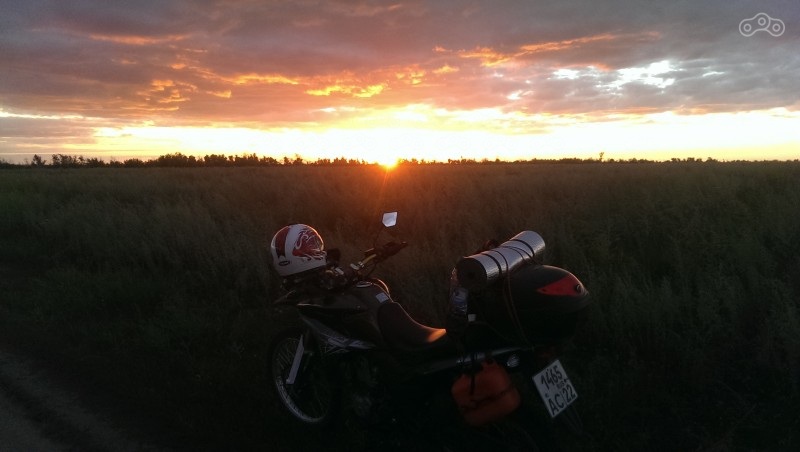 И вот, в районе часов восьми, мы мчимся по трассе. Надо отметить, что Лёхин мотоцикл был совсем новый и еще на обкатке. Я думал, что поедем мы не быстрее 80 км/ч (чтоб не напрягать сильно движок), но проехав около двадцати километров, Лёха жарил уже около 100-110. Мы ехали на встречу закату, периодически останавливаясь на перекуры и сверяясь с навигатором. До первой предполагаемой стоянки нужно было преодолеть около 200 км. На очередном перекуре, глядя как солнце неумолимо скрывается за горизонтом, я предложил не ехать дальше, а здесь съехать с трассы, найти полянку и заночевать. Ехать до места оставалось около 50 км, а темнело прям на глазах. Ставить палатку, искать дрова и готовить еду в темноте, то еще удовольствие, поэтому было принято волевое решение дальше не ехать.