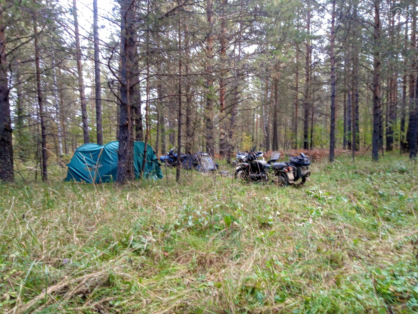 Екатеринбурга им предстоит проехать 400 км заблудится проколоть два колеса и приехать уже затемно. На четыре часа позже на своем синем урале выежают и я. Неспеша преодолеваю 80 км и разбиваю лагерь в сосновом лесу не подалеку от села Идрисовсо. Солнце скрывается за горизонтом и наступает полная темнота разгоняемая пламенем костра .