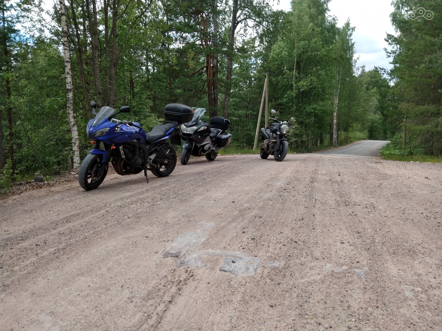 Мы же едем дальше вдоль восточного берега озера. Наш план к вечеру быть в районе Лодейного Поля. Есть, как минимум 2 пути туда добраться. Короткий - вдоль берега через Пяткаранту, Салми и Видлицу. И подлиннее – по А-121 через Пряжу. Мы, естественно, настроились на первый, который, помимо прочего, сулил продолжение захватывающих видов. Однако, свернув в районе Ляппясилта (ох уж это великий и могучий финский) мы попали на путь, который порадовал бы только того самого владельца Африки. Старый разбитый асфальт заставлял задуматься не только о самочувствии мягких частей тела, но и о здоровье мотоцикла. Ехать так почти 200 км совсем не хотелось. На заправке поинтересовались у местных, и они подтвердили, что до Олонца вся дорога такая. Возвращаемся на А-121. Тут, как раз с асфальтом полный порядок. Широкая прямая и абсолютно пустая трасса, окружённая непроницаемым «забором» из леса. Ни заправок, ни посёлков, ничего. Ехать тут откровенно скучно. Начинало вырубать, поэтому стали выкручивать для бодрости духа. МТ охотно едет в скоростном темпе. Даже на 160 мотоцикл мощно рвётся вперёд при открытии газа, шасси и тормоза в своей стихии. Главное держаться за руль, и лучше использовать беруши. За час такой езды слух начинает просить о пощаде. И ещё до заправки я доехал «на парах». В таком темпе бака уже едва хватило на 150 км. Немного более мощные и обтекаемые товарищи, естественно, шли не хуже. Но Фазер утомил крупного Саню посадкой, а РТ почему-то сожрал резину!