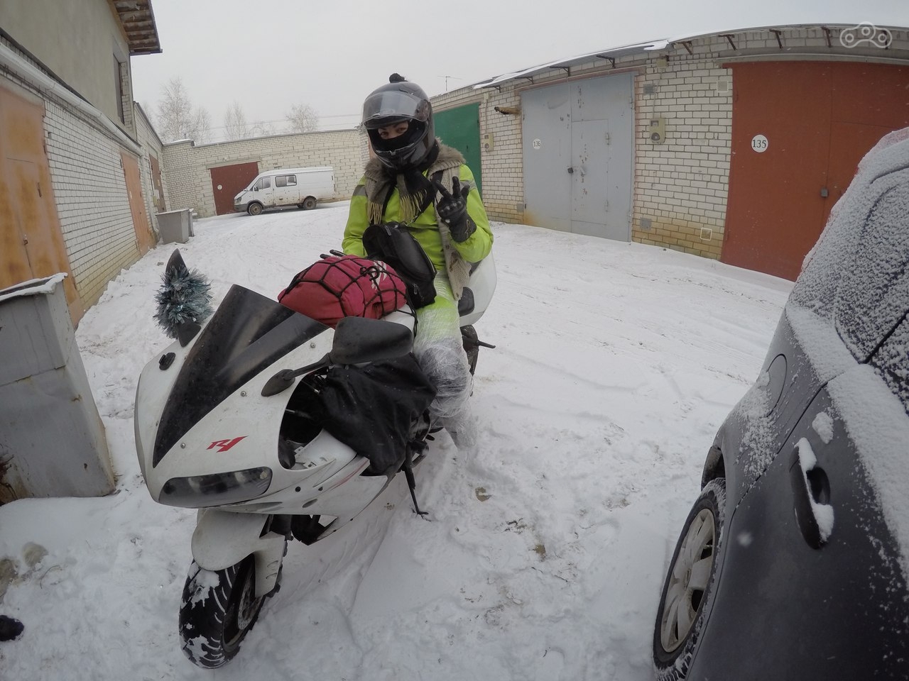 Настал этот момент, шмотки сухие, нужно ехать. На улице -10, уже нехотя открыв дверь подъезда, садимся на мотоцикл, в путь!