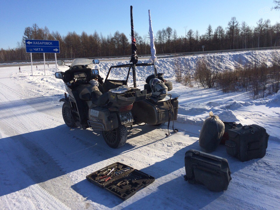 Главной движущей силой поездки стал мотоцикл BMW K100LT 1987 года, с установленной на него коляской от «Урала», доработанной подвеской и автомобильными колёсами. В ходе поездки, путешественникам несколько раз приходилось заниматься ремонтом – от холода у мотоцикла периодически отказывала электрика и GPS-трекер, а у подвески бокового прицепа вытек амортизатор, после чего пришлось искать запчасти и производить замену.