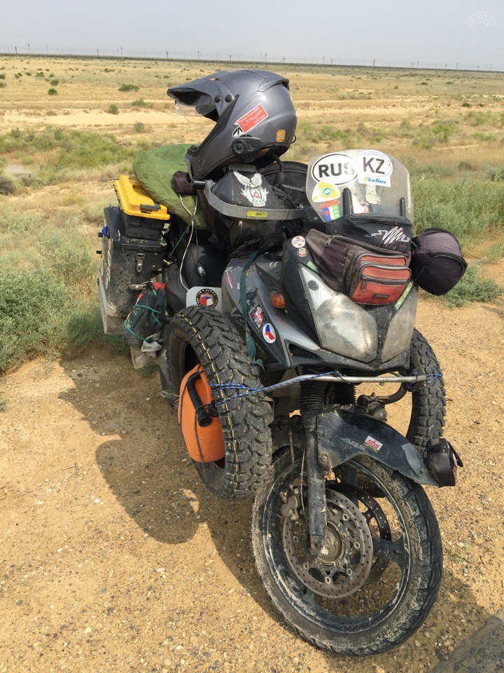 «Лёд тронулся, господа присяжные заседатели!» — говорил главный герой романов Ильфа и Петрова. Льда, конечно же в жарком Казахстане не было, а вот тронуться в этот день вполне могло получиться. Но обо всем по порядку. Ранним утром, попрощавшись с гостеприимными хозяевами дома в Алма-Ате, я выкатил на трассу в сторону озера Балхаш. Это уникальное озеро имеет одну интересную особенность — с одного берега половина озера соленное, а с другого — половина с пресной водой. Но, увы! Насладится водой в озере Балхаш в этот день мне было не суждено, мне выпало палящее солнце на трассе в 400 км от Алма-Аты и 200 км до одноименного города Балхаш. А именно на скорости в 120 км\ч рвется замок цепи и я, благополучно, скатываюсь вниз с горочки и встаю на обочине. Пройдя сотню метров, я подбираю с раскаленного асфальта цепь и возвращаюсь к мотоциклу. И хорошо, что цепь просто выкинуло со звезд, разорвав крышку, которая прикрывает ее от грязи, иногда последствия бывают гораздо хуже, например заблокированное заднее колесо на ходу. В Алма-Ату была отправлена смс, а я вместе с мотоциклом побрел до ближайшей чайханы, которая оказалась в 1,5 км от места поломки. Я вам скажу так, тащить по сорокоградусной жаре двухсоткилограмовый мотоцикл это тот еще кросфит =)