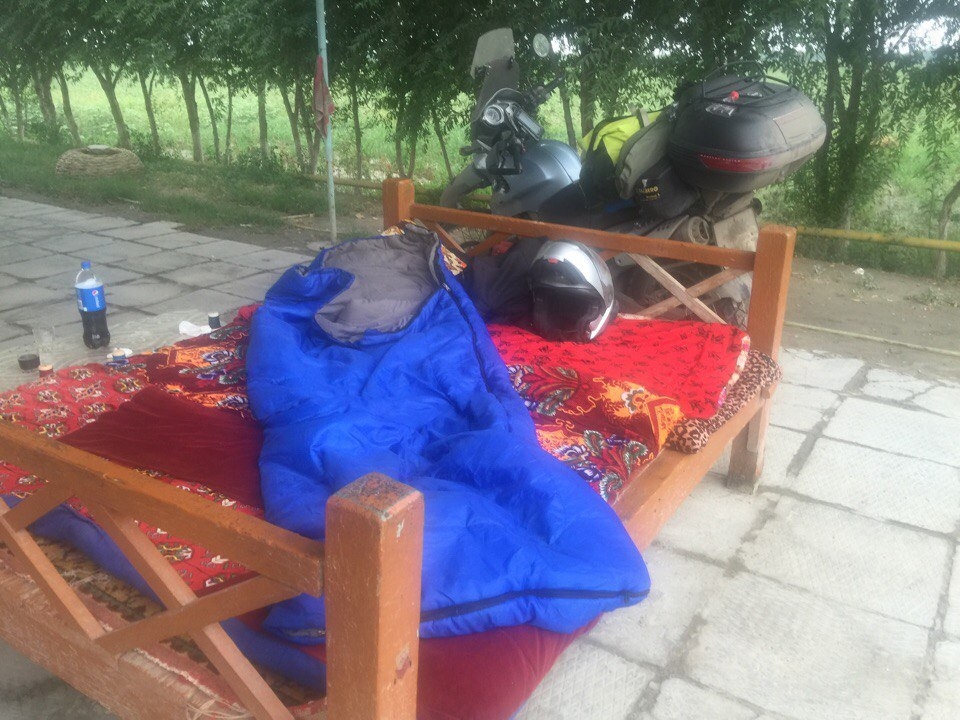 Вернемся к седьмому дню, а точней к его вечеру. Лампочку, как и на всех югах, солнце здесь выкручивает быстро, поэтому не успеете опомниться, как на дороге хоть глаз выколи. Я предпочитаю ночью не ездить, так как считаю это не безопасным. Как только стемнело, я заруливаю в чайхану, где разговорившись с хозяевами, мне предлагают спать под открытым небом на топчане, к слову, это распространенный способ ночлега в Узбекистане. В дело был пущен спальный мешок. ( пробег 587 км)