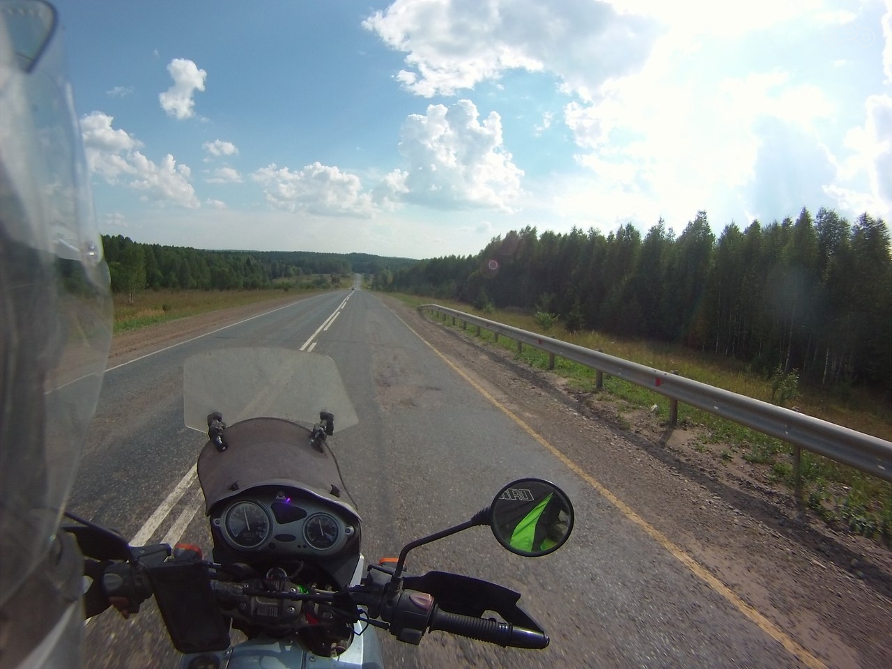 Пришло время выдвигаться в сторону Санкт-Петербурга, строго на запад. Предстояло преодолеть около 4 тысяч километров, в хорошем спортивном темпе за 4 дня, а также по пути решить какой дорогой ехать, вариантов масса и по всем ним я уже ездил в детстве с родителями на машине. Выбор был сделан в пользу Екатеринбурга, и был сделан очень просто: на одном из привалов, где-то под Тобольском разговорились с водителям микроавтобуса, который возит людей чуть-ли не через всю Россию, который мимолетом сказал мне, что трасса через Уральские горы убита и загружена фурами. Ну что же, выбор был сделан — едем в Екб. По пути небо опять разделилось на две половины, с грозами по правую руку и солнцем с левой стороны. Я немного напрягся, вспоминая, каким дождем на 300 км. меня встречал родной округ несколько дней назад. Но в этот раз обошлось, я проскочил буквально по краю, сухой и довольный. Концепция ночевок немного изменилась — пришло время недорогих придорожных кемпингов, которые существенно сокращают время разбора и сбора лагеря.