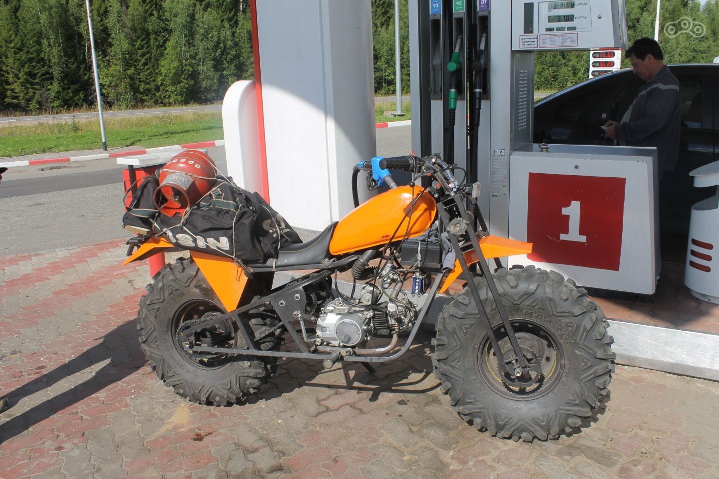 Самое интересное ждало меня на обратном пути. До дома 603км со скоростью 50км\ч под сильным дождем который начался сразу на выезде, он преследовал меня до самого дома, как будто туча шла на той-же скорости и делала те-же остановки. Представте себе фуру в ливень, которая вас обгоняет. Представили? А теперь представте 10,100,1000 фур. Визор запотевал и иногда прилетала порция воды в шлем. Двигатель работал на пределе своих возможностей. Под самым Сыктывкаром я встретил парня на внедорожном моте,(его я видел еще когда только ехал в киров и тут на обратном пути снова он) у него что то с клапанами и ехать он не может. Привязали его мот к скутеру и на буксире я тащил его до города. Скутер и это пережил.