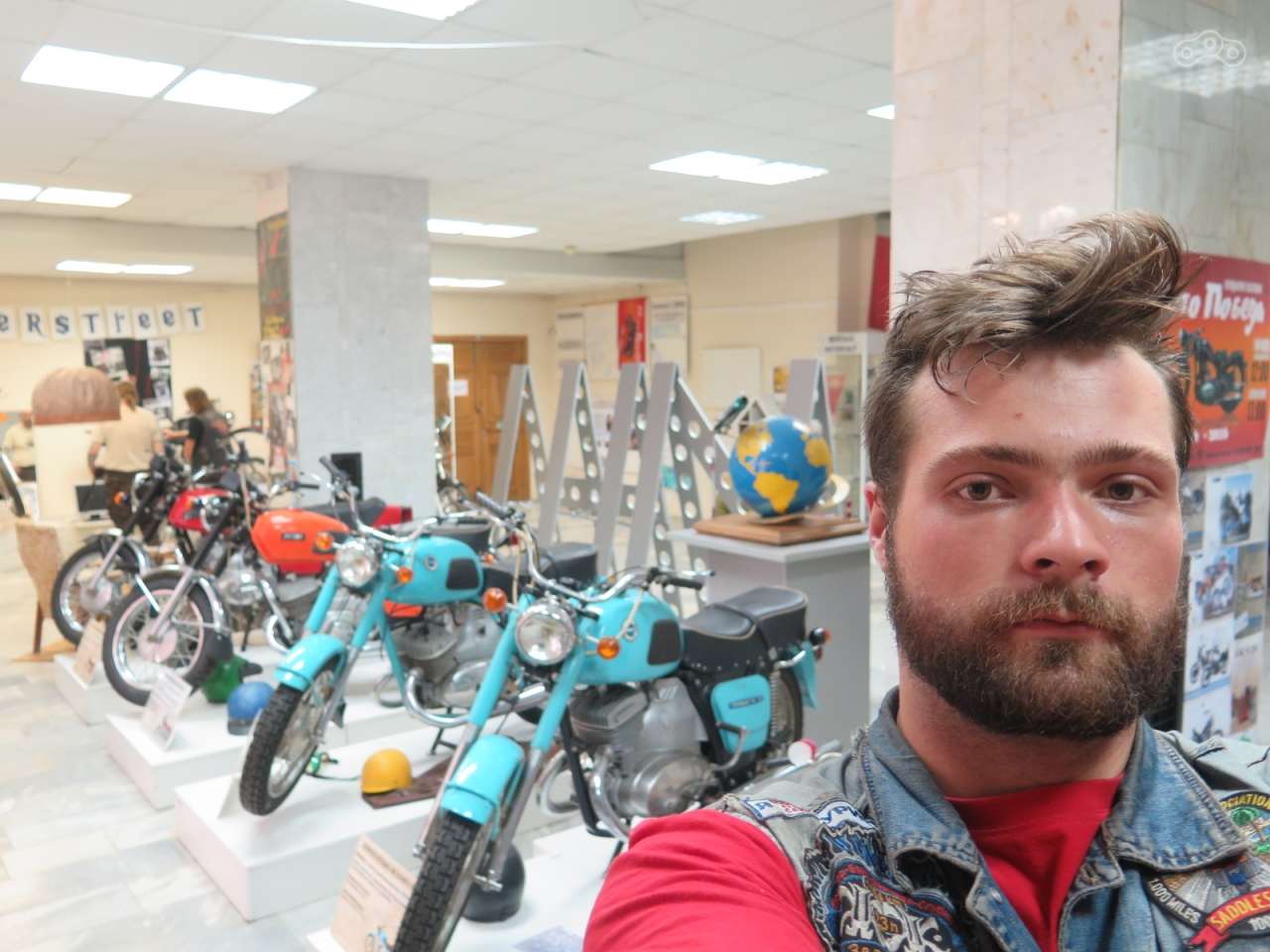 Игорь - большой энтузиаст мотодвижения и фанат ижевских мотоциклов принял нас как родных, пустил в свой гараж - настоящий осколок давно ушедшей эпохи, с фотографиями на стенах, советскими мотоциклами и знаменами на стенах. Среди этого антуража так и хочется забыть какой сейчас год и приняться за начесывание хаера, вечером же Сектор Газа выступает!