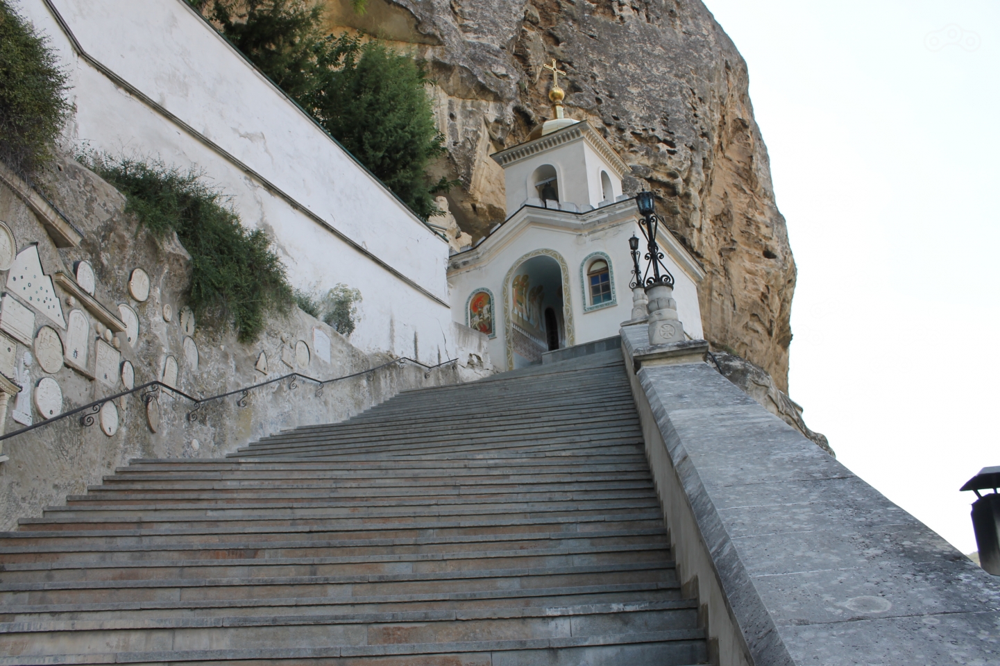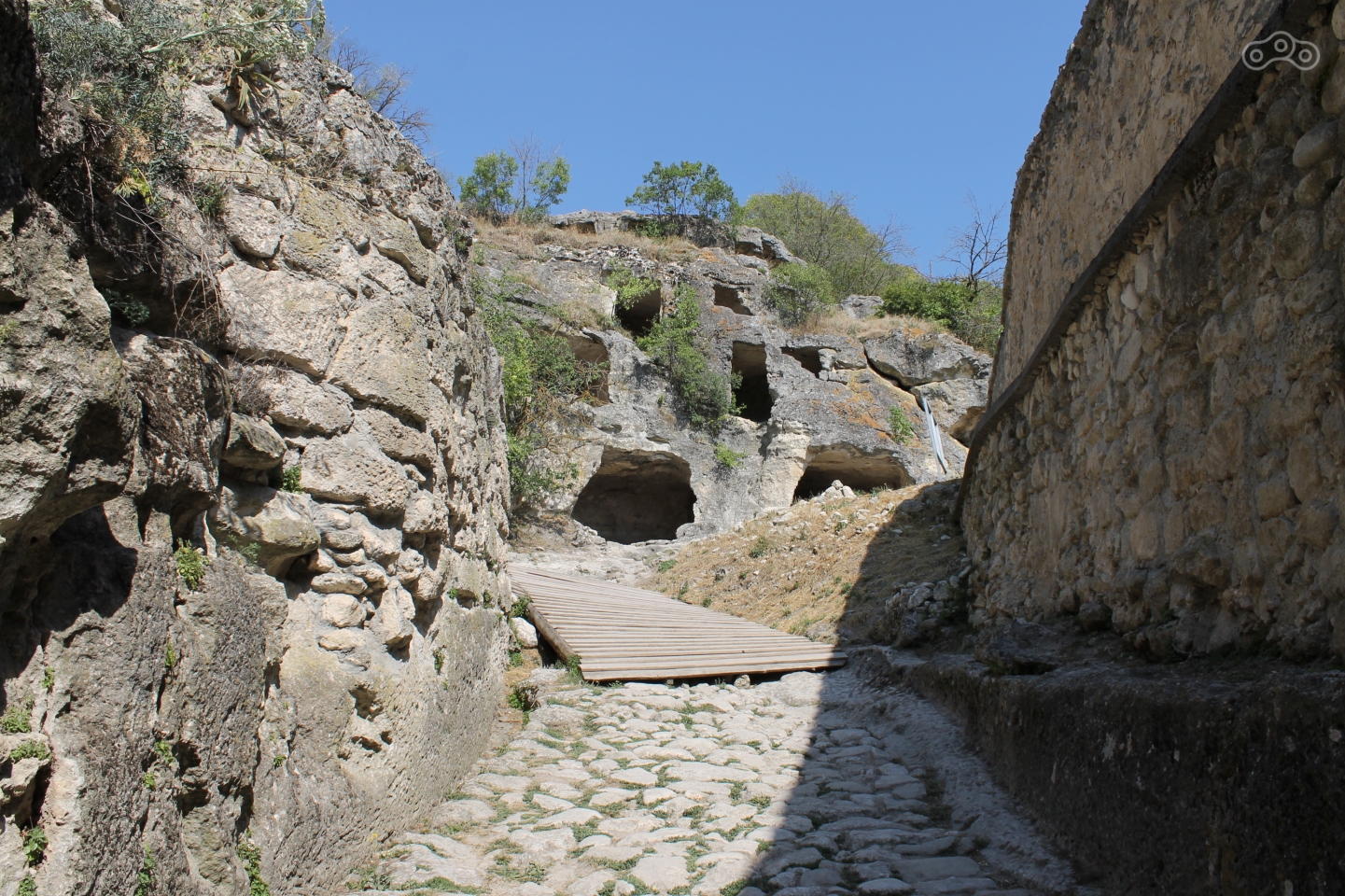 Отсюда мы поехали в Чуфут-кале – пещерный город. В Бахчисарае везде предлагают поездку к пещерному городу на УАЗиках. Мы подъехали максимально близко к территории заповедника. Машины туда пропускают типа только за деньги, но это все неофициально: нет ни знаков, что парковка платная, ни соответствующих документов у сборщиков дани. Мы поставили мотоцикл около Успенского пещерного монастыря и отправились пешком. Идти нужно порядка 1,5-2 км с небольшим подъемом в горку. Сам пещерный город поражает масштабом и количеством сохранившихся построек.