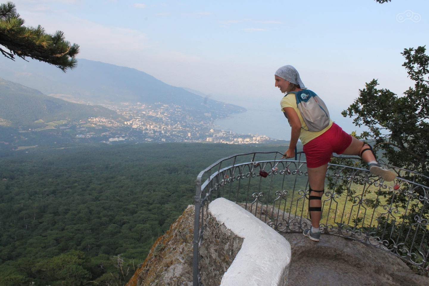 Не смогли мы проехать мимо Серебряной беседки. Отсюда открывается шикарный вид на Ялту, окруженную с одной стороны морем, с другой – зелеными сосновыми кронами. К слову, я влюблена в корабельные сосны, растущие в этих местах. Они такие величественные, мощные. И хоть места в мотоцикле мало, но я взяла несколько сосновых шишек на память.