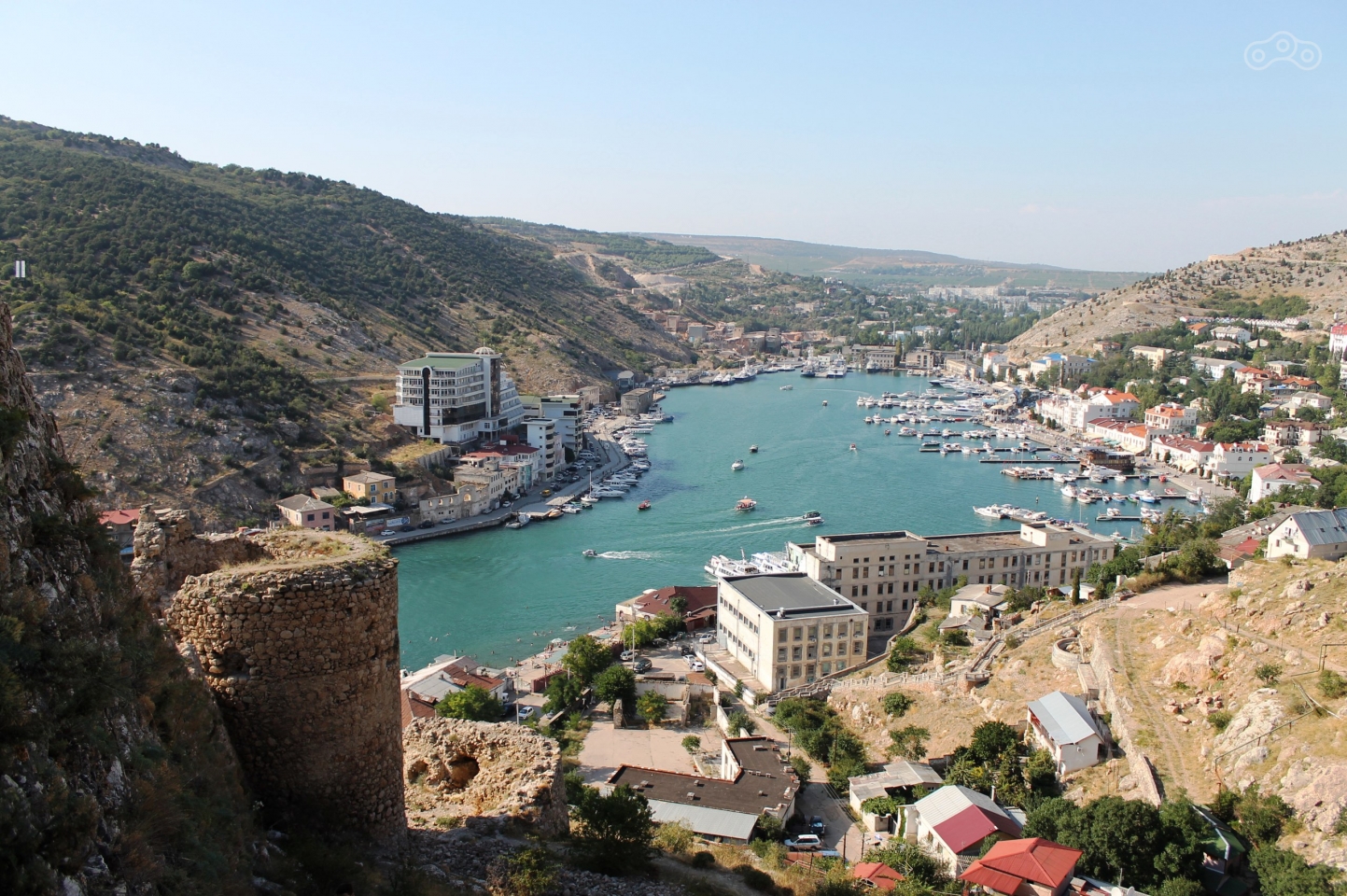 В Балаклаве даже мотоцикл негде припарковать. На набережной толпа народу. Но мы ушли подальше от шума и суеты к развалинам генуэзской крепости Чембало. Ансамбль средневековых крепостных сооружений расположен на вершине и склонах горы Крепостной. Отсюда открывается восхитительный вид на балаклавскую бухту и море.