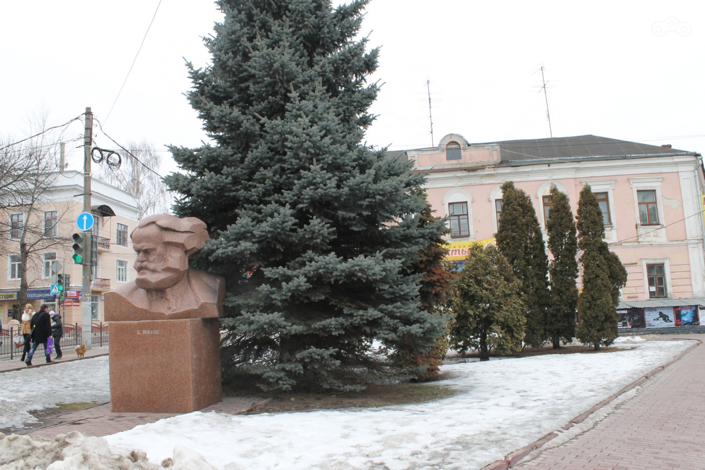 Ну, а пройдя мимо, мы оказались на площади Маркса. А тут что? Правильно – бюст известному немецкому философу (экономисту, писателю, поэту, социологу….) Карлу Марксу и советские голубые ели.