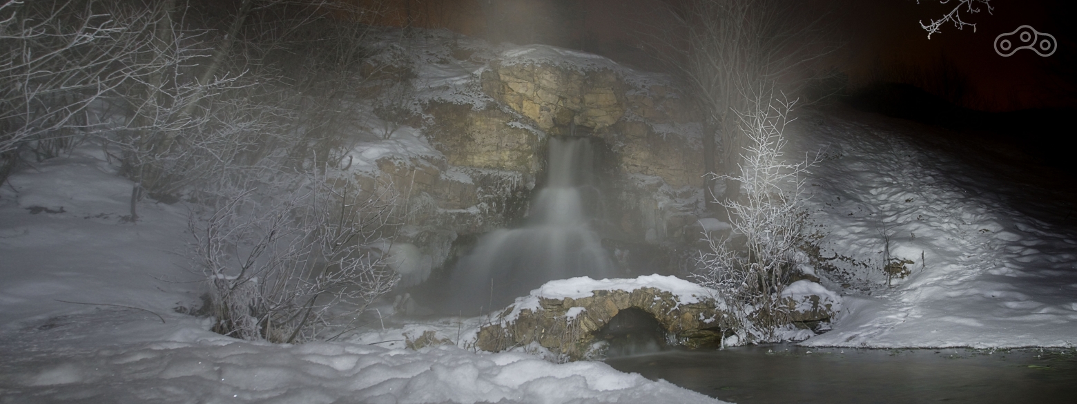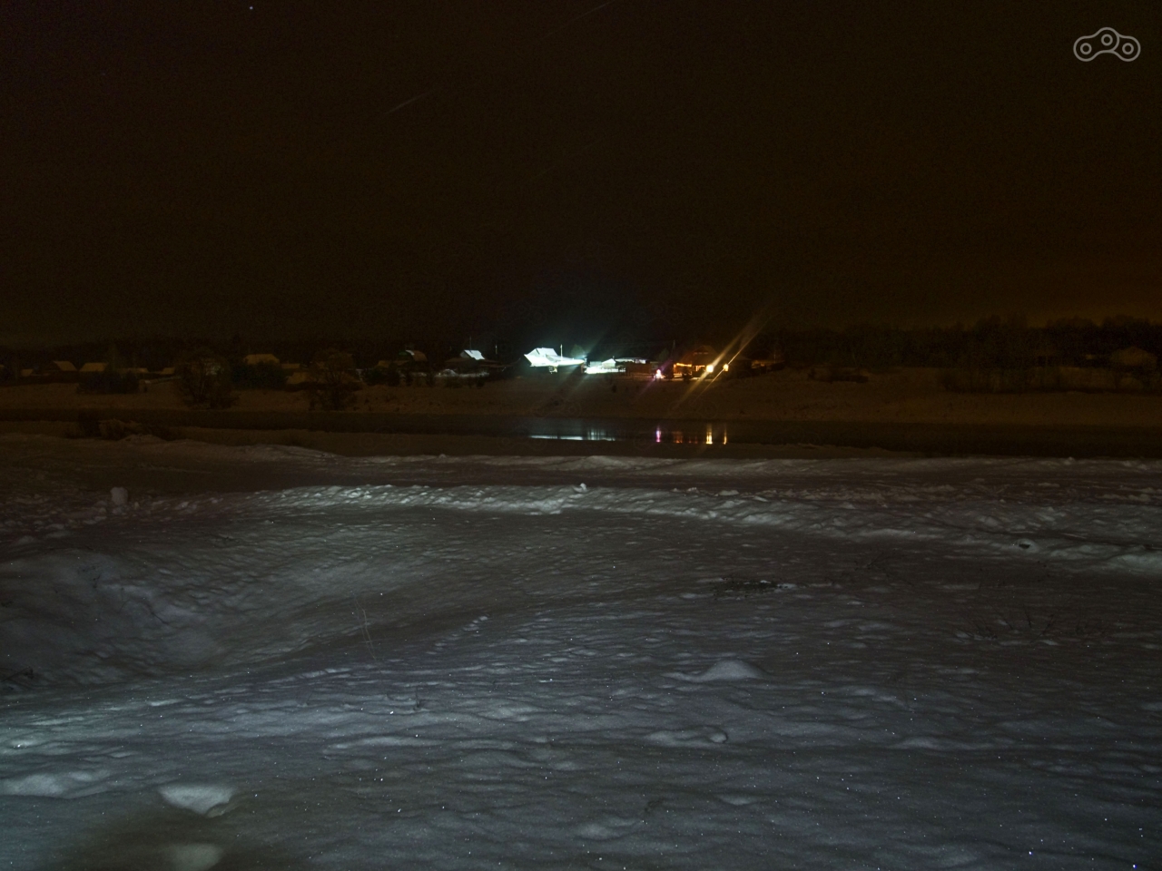 Я поигрался с фотоаппаратом, пытаясь сквозь туман запечатлеть зимний водопад. Вокруг него деревья были покрыты инеем, а мостик вообще был покрыт толстым слоем поблёскивавшего в лучах фонарика льда, поэтому на ту сторону ручья я перейти не рискнул. Когда я вернулся к мотоциклу, то увидел на другой стороне реки Тверца в деревне Брячково красочно светящийся дом и ёлку. В сочетании со звёздным небом и выглядывавшим из-за облака месяцем это выглядело сказочно, и я попытался запечатлеть эту волшебную картинку.