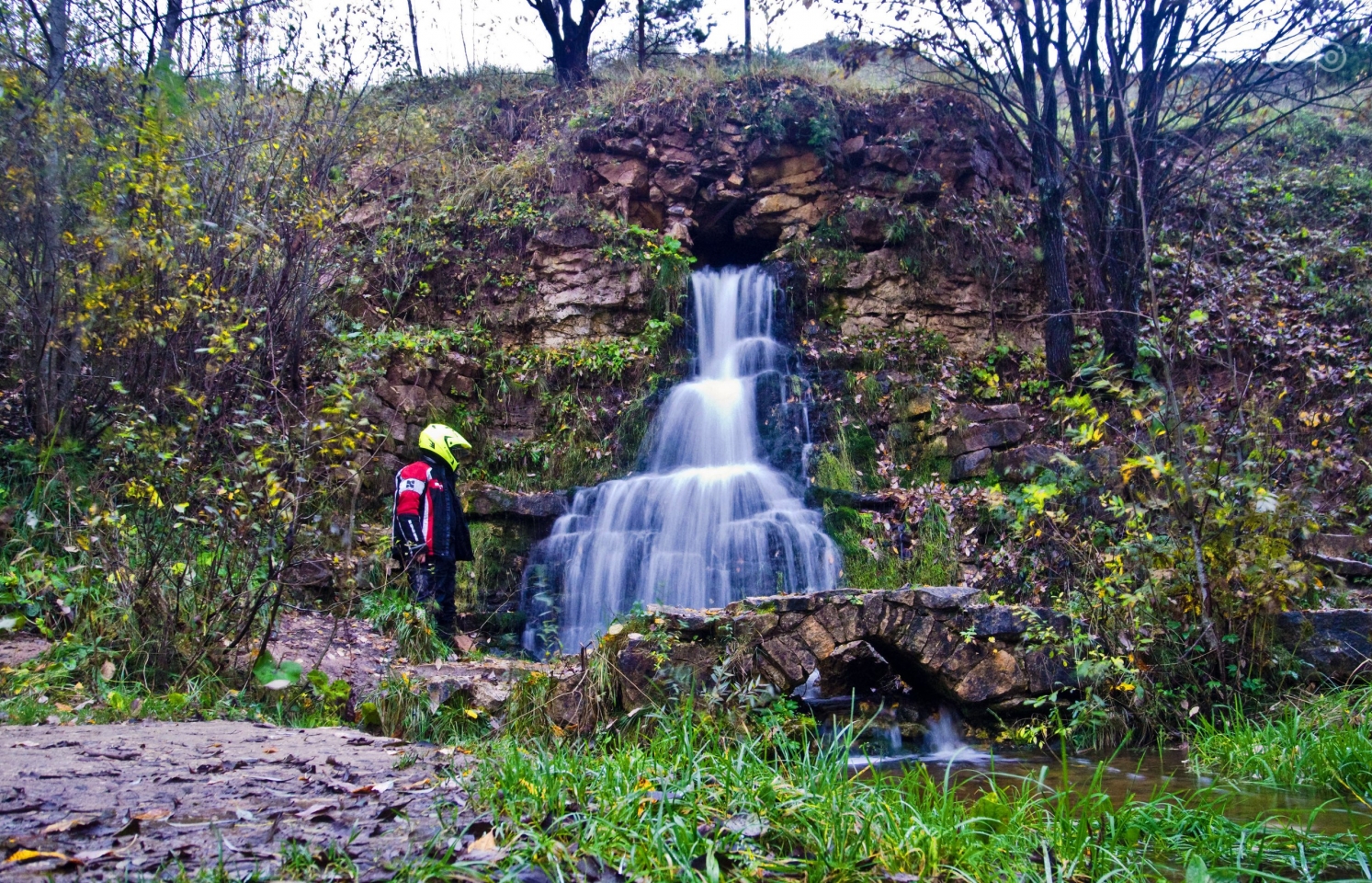 Больше всего я боялся встретить непролазные сугробы за деревней, однако дорога к водопаду оказалась укатана автомобилями, и я без труда доехал до полянки возле водопада. Последнюю сотню метров пришлось пройти пешком, т.к. к самому водопаду ведёт очень узкая тропинка вдоль озерца, по которой на мотоцикле не очень-то проедешь. Впрочем, когда я оказался возле самого водопада, я подумал, что это даже хорошо, ведь возле него в воздухе стоял морозный туман, что могло негативно отразиться на электрике. У меня зимой уже как-то накрывался моторчик вентилятора из-за перепадов влажности и температуры.