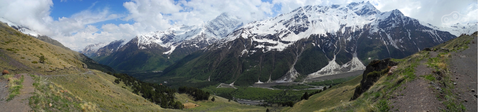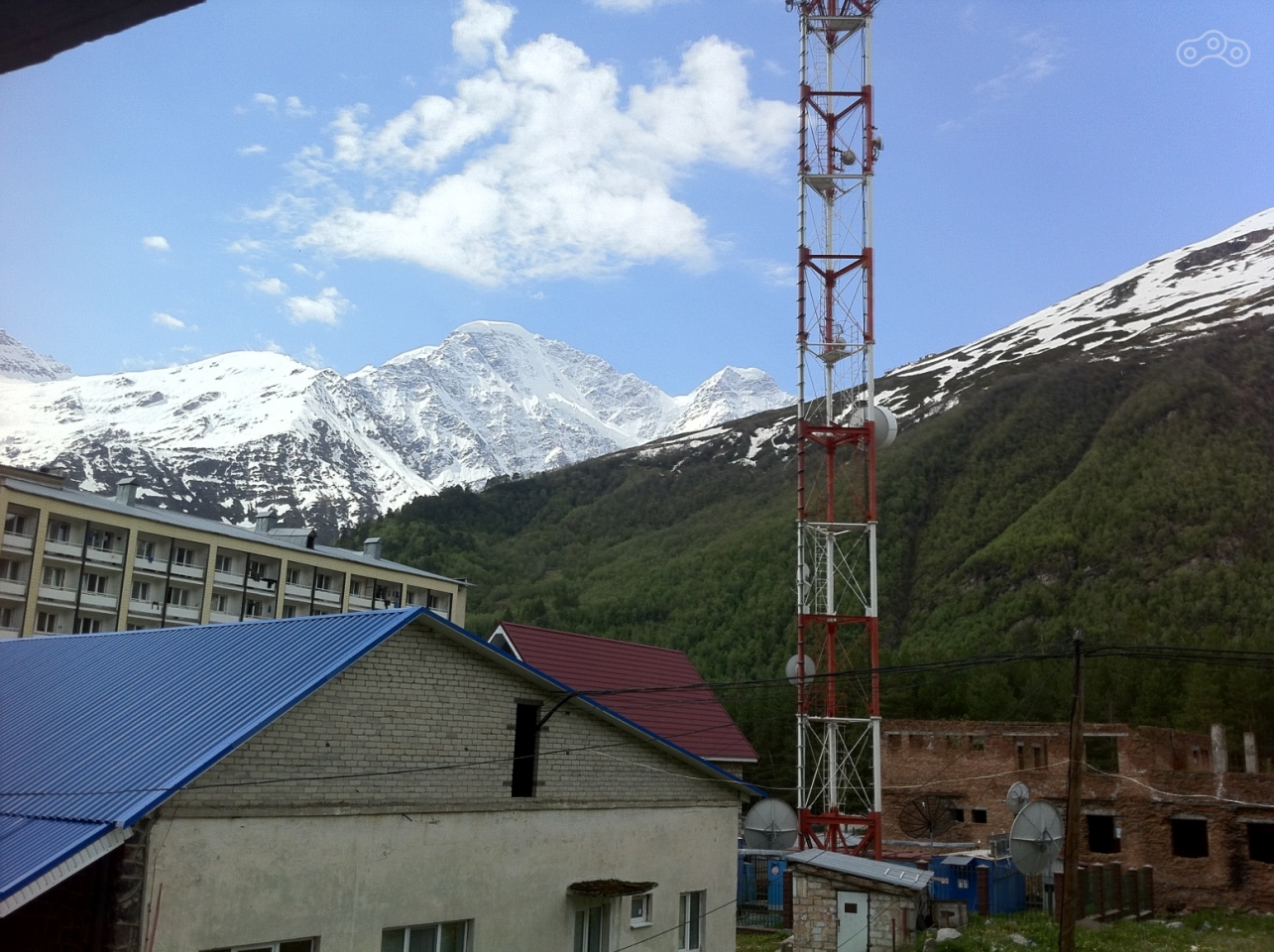 Я давно не спал так крепко и сладко, а вид из окна на утро придал бодрости и хорошего настроения. Первое, что я сделал с утра, это связался с Лёхой, который знает эти места как свои пять пальцев. Он порекомендовал мне в качестве жилья частный гостевой дом во дворе возле кафе Байрамук, а также накидал несколько точек в этой местности, куда можно было попробовать забраться на мотоцикле. Я не спеша собрался, перекусил омлетом (еда в Куполе не очень дешевая) и поехал договариваться насчёт жилья. Когда я подъехал к Байрамуку, стоявшая там женщина приняла меня за сына Розы и Исхака - видимо она знала, что он мотоциклист, но не видела его, т.к. мы со всем не похожи. В этот момент там стояла машина замдиректора национального парка Приэльбрусье. С подачи этой женщины, выяснилось, что проезд на Джилы-су со стороны Баксанского ущелья существует (через Тырныауз), но в июле там уже начнут ставить запрещающие знаки. Я сделал себе отметку, что надо обязательно прокатиться по этой дороге, пока не запретили.