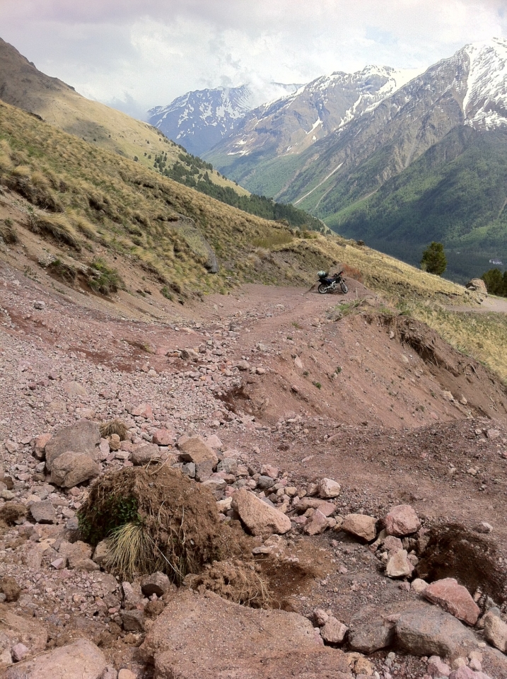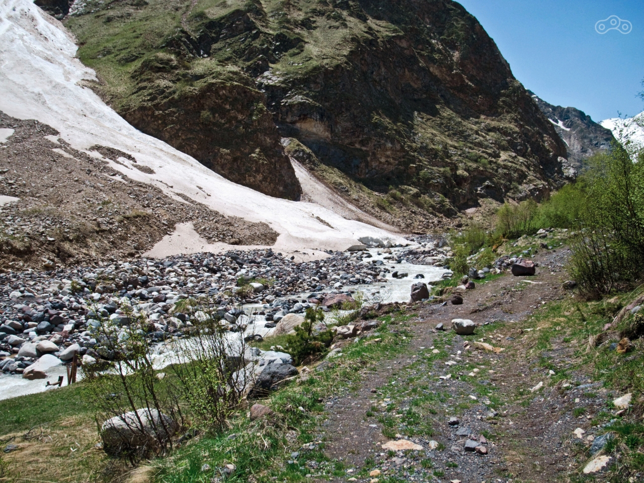После коровника начался довольно крутой грунтовый серпантин с разворотами и одновременными подъёмами. На дороге часто встречались пешеходы с трекинговыми палками, как правило без рюкзаков, но в довольно тёплых куртках. Поднявшись на 2569 метров (согласно GPS), мне пришлось бросить мотоцикл на небольшом пятачке, потому что дальше был обвал дороги, осталась довольно узкая тропа, густо усыпанная камнями, которые так и норовили убежать из под ног. Проехать там в одиночку на изношенной полуасфальтовой резине с багажом (оставить часть багажа в гостевом доме я не догадался) я не рискнул. Был некоторый шанс улететь вниз вместе с мотоциклом. Хотя будь я в компании, я бы попробовал, тропа была достаточной ширины и шансы на успех мероприятия тоже были. Я повесил замок на тормозной диск и пошёл дальше пешком. Погода была переменчивая, менялась каждые 10 минут. Солнце то жарило, то пряталось за облака, и дул мягко говоря освежающий ветерок. Лето в этом году итак не задалось по погоде, а на такой высоте и того было порядка 14-16 градусов днём и около 6-8 градусов ночью (почему собственно в гостинице и работало отопление). Пройдя около километра, я осознал, что я снова лоханулся и не взял питьевую воду, а солнышко заметно пригревало. Я снял верхнюю футболку, обмотал её вокруг головы и положил сверху снежок из попавшегося очень кстати сугроба. Получилась этакая освежающая шапочка, которая, кстати, совсем не торопилась таять.