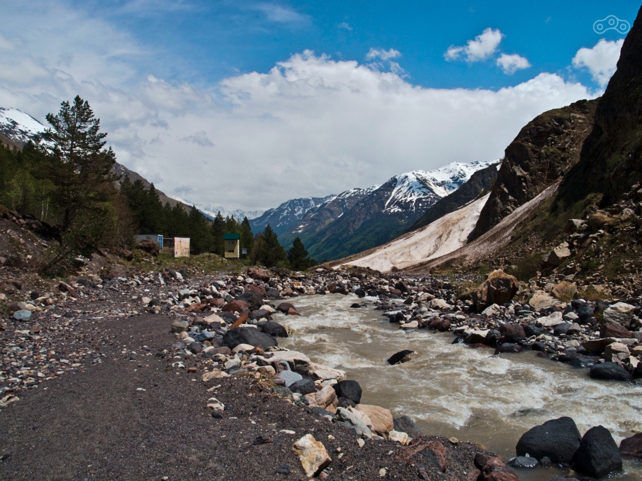 На подъезде к Терсколу дождь закончился. Я остановился в указанном знакомцем месте в поисках нужной гостиницы, но катастрофически не мог найти то, что он мне описывал. Вокруг стояли все здания, которые должны были стоять, кроме того, которое нужно. Я задолбал его звонками, в итоге он выключил телефон. Ту самую гостиницу я так и не нашёл, есть подозрение, что её просто уже снесли, т.к. примерно там, где она должна была располагаться, находился подземный гараж и строительная площадка.