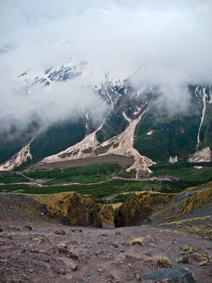 Вернувшись к повороту, я решил собрать в себе силы, коих оставалось не много (на такой высоте любая физнагрузка даётся с трудом, а я вообще совсем не в хорошей физической форме сейчас), и подняться ещё выше к обсерватории, на высоту около 3000 метров. Топать туда предстояло около километра, но оттуда как раз спускались двое парней с палками и они меня отговорили от этой затеи, т.к. я был легко одет, без палок и воды, а наверху, по их словам, снега чуть ли не по пояс. Я поделился «картинкой» про наблюдавшего на нас с водопада тура, на что мне рассказали, что оказывается, туры не умеют ходить задом. Когда они лезут по скалам всё выше и выше, то в определённый момент попадают в ситуацию, кода дальше лезть некуда. Тогда они прыгают головой вниз, а их рога выступают в качестве амортизаторов при приземлении. Я уж не знаю, на сколько это правда, но на тот момент мне это показалось правдоподобным – я впитывал всё окружающее с восторгом и доверчивостью ребёнка. Я отметил, что у мотоцикла тоже нет задней передачи. Ребята переглянулись, но промолчали.