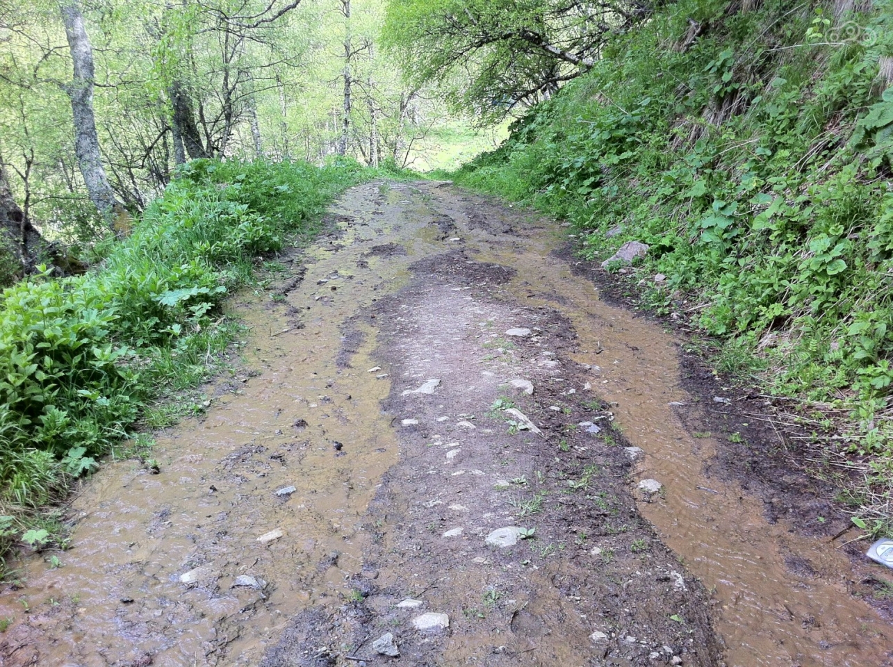 К этому моменту наше местонахождение стало затягивать облаками, причём облака в том числе были на нашем уровне высоты, казалось можно протянуть руку и дотронуться до них. Однако это стало ещё одной причиной, почему я не пошёл дальше наверх, тем более что по словам парней метеоролог в метеостанции наверху спрогнозировал скорый дождь. Собственно дождь не заставил себя долго ждать, но он лишь слегка накрапывал и в целом не напрягал. Я не спеша спустился до мотоцикла, завёлся и стал спускаться, догнав по пути этих ребят. Проходить такие крутые повороты вниз оказалось несколько сложнее, чем вверх. Вероятно на более внедорожной резине было бы проще. Что интересно, дождь накрапывал похоже только наверху. Внизу было в основном сухо, если не считать текущих с гор ручьёв. Возле коровника поперёк дороги лежал брус. Я уж не знаю, это в качестве шлагбаума там положили или в качестве мостика через ручьи, но когда я поднимался, его там не было. Я бодро перескочил через брус и вышел на асфальт.
