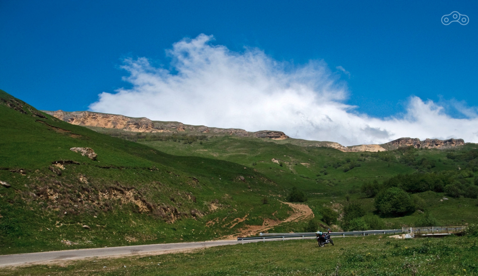 Очень напрягали периодически попадавшиеся дорожные работы. Асфальт укладывали и тут же открывали для проезда, потому что вариантов объехать не было. В результате мотоцикл медленно, но верно продолжал покрываться чёрными точками. За Тырныаузом на укреплённом блок-посту, охраняемом солдатами с автоматами, мне махнул палочкой инспектор ДПС. Я остановился и уже приготовился доставать документы, когда услышал фразу «Ну что, Москва, домой двигаешь?». Тут меня чёрт дёрнул сказать инспектору правду, что я еду в Нальчик в банкомат. Никогда не давайте инспектору ДПС понять, что у вас есть деньги! Дошло до меня это правда только потом, как и некоторые другие нюансы знаменитого «кавказского гостеприимства». Инспектор удивился, зачем тащиться в такую даль, если у них есть банкоматы, но я сказал, что во-первых мне нужен банкомат ВТБ24 (Сбербанковский-то банкомат и в Терсколе есть), а во-вторых банкомат тут только повод для того, чтобы прокатиться и полюбоваться красотами Баксанского ущелья. Он меня отпустил и я помчал дальше. По пути пару раз пытался начаться мелкий дождь, но всё ограничилось небольшой моросью, после чего солнце снова выглянуло, а поскольку я спускался относительно уровня моря, то становилось заметно теплее.