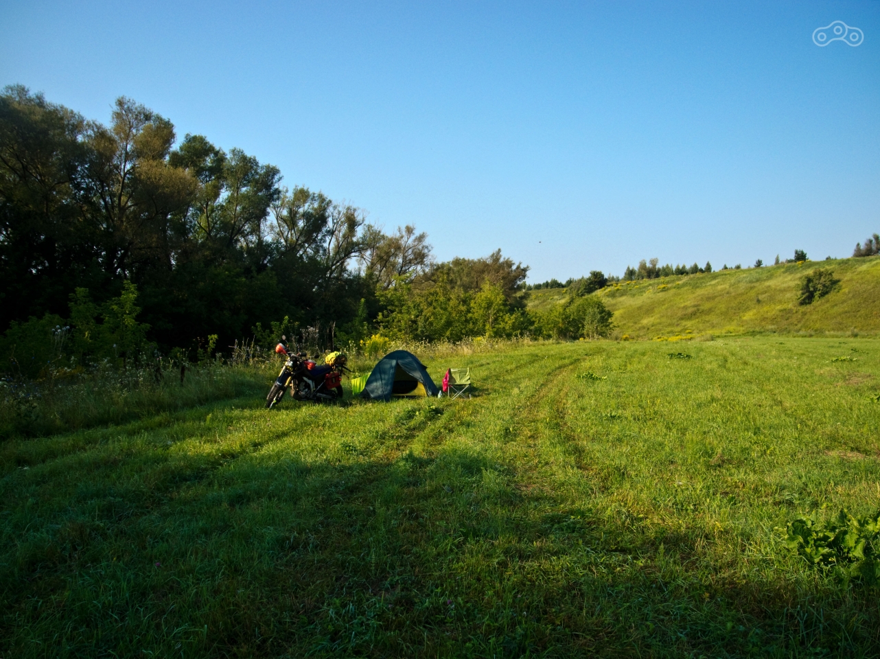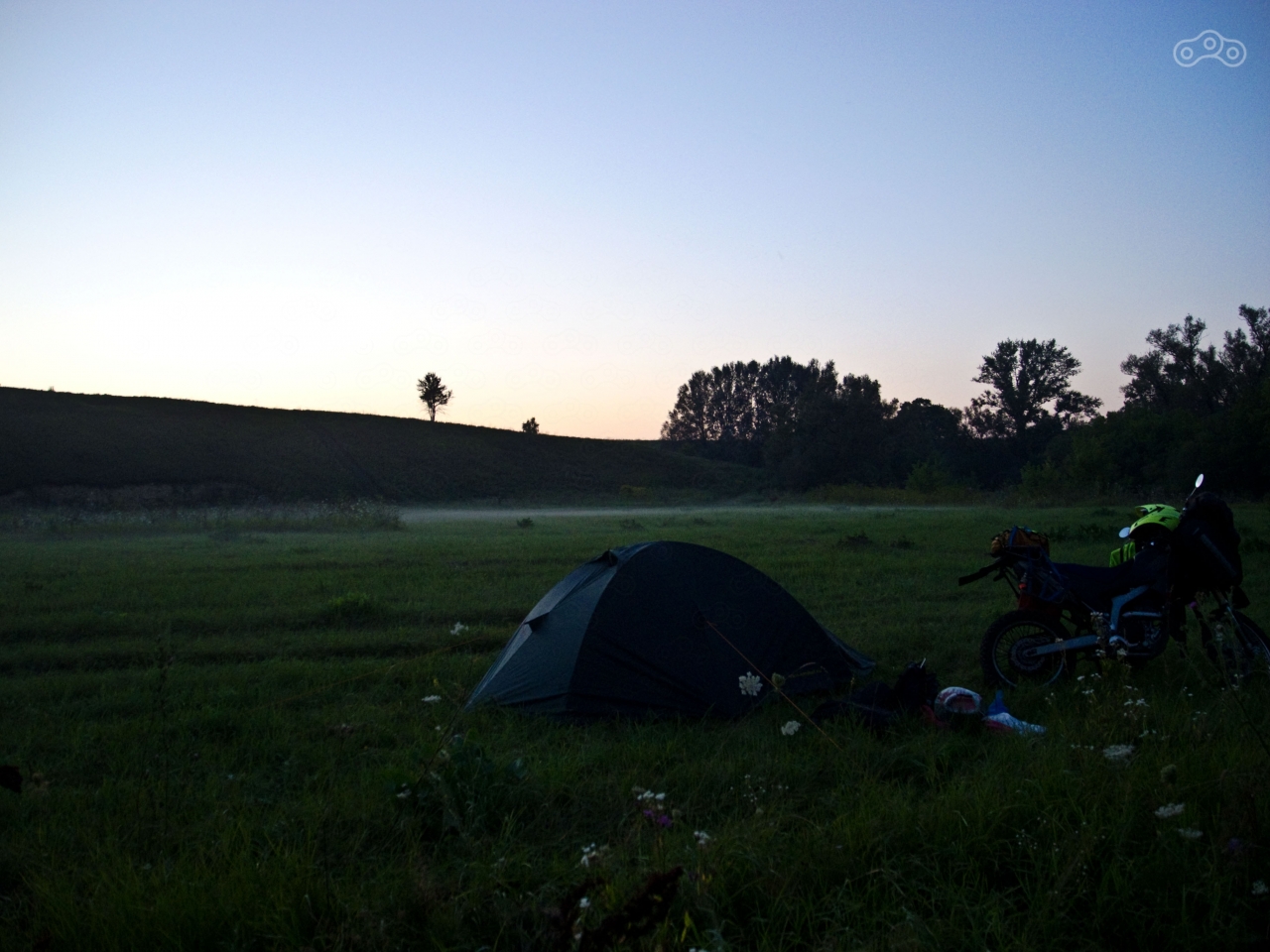 Я зарулил на АЗС Роснефть, чтобы вымыть руки, заодно прополоскал в раковине футболку, которую щенок всю заслюнявил. Уже смеркалось, поэтому я устремился к месту назначения. Подъехав к Оптухе, я снова остановился в нерешительности. Не люблю я лезть в броды в одиночку, особенно на лысой резине, даже если там глубина всего лишь по колено. И в этот раз тоже не решился - перебрался на другую сторону через пешеходный мост. Местные, резвившиеся в воде, смотрели на меня удивлённо. Я проехал мимо 2-3 компаний отдыхавших на уже полюбившуюся мне полянку между рекой и холмом. На моей же полянке никого не было. Трава только за пару месяцев с последнего моего посещения успела вырасти очень высокая, но была частично скошена. Солнце уже село за холм, и над землёй потихоньку стал расползаться туман. Я развернул лагерь у самой реки, надеясь, что чехол для мотоцикла не понадобится, периодически посматривая на крутой склон холма, где были отчётливо видны следы автомобиля. Было большое желание попробовать на него заехать, но я решил оставить это на утро.