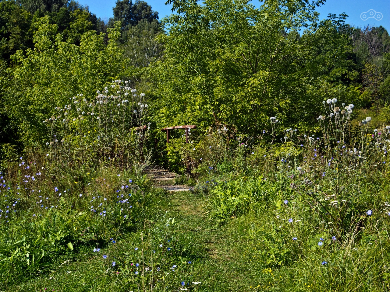 Я посмотрел на лысый задний баллон, на склон холма и решил отложить его штурм на другой раз, когда буду не один или хотя бы не на лысой резине. Я последний раз проверил, что ничего не забыл, и поехал в сторону брода. В этот раз я выключил режим очкования и всё же переехал реку вброд. Брод оказался не особо глубоким, но каменистым, а течение не сильным, но разок зад всё же немного снесло на мокрых камнях. Мотоцикл лёгкий и его даже не сильным течением сносит. Я выбрался на дорогу и поехал в сторону Орла, намереваясь вернуться домой через так понравившуюся мне в своё время дорогу P-92, однако на полдороги вернулся, т.к. забыл, что хотел сфотографировать пешеходный мост через реку.