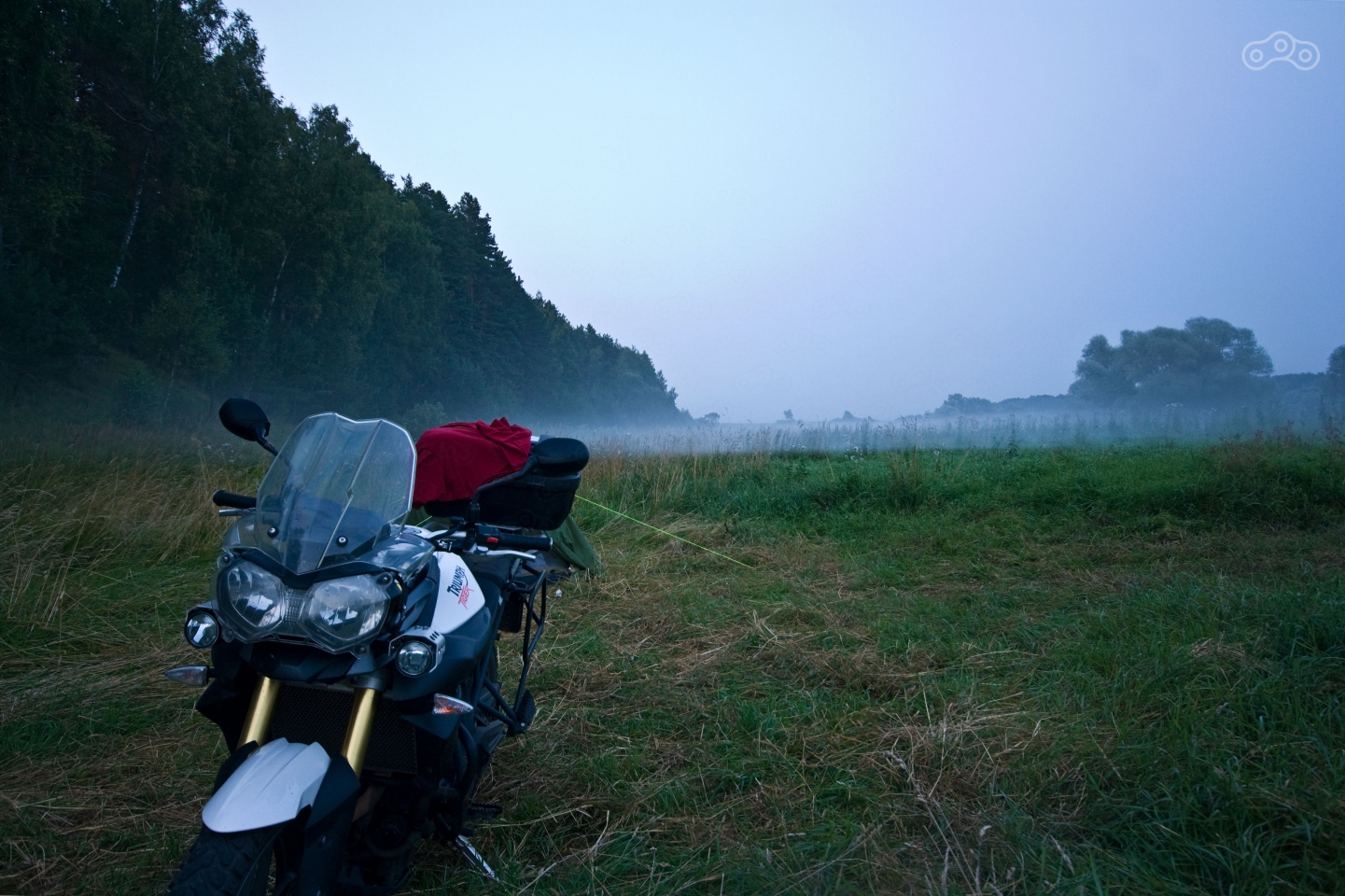 И тут встал вопрос о том, что место-то нравится, мы остаёмся, но еду-то мы так и не купили. В итоге я взял деньги, Дилярин Triumph Tiger 800 и погнал обратно в Климов Завод, дабы закупиться вкусняшками к чаю на вечер и на завтрак. После моей чекушки мне было сперва непривычно управлять кубатурным дорожным мотоциклом. Он намного легче контр-рулится на скорости, и у него совсем другие передаточные числа (я большую часть времени ехал на 6 передаче). А вот на околонулевой скорости мне очень не понравилось им управлять, он так и норовил завалиться на бок. Мне нравятся более короткие, узкие и юркие мотоциклы. Впрочем я быстро адаптировался. Также я ощутил огромную разницу в аэродинамике и ветрозащите. На моей Ямахе уже на 90 км/ч в грудь и шею дует неслабый ураган, а в ушах стоит гул ветра, за которым порой не слышно даже MP3-плеер. На Тайгере же я совершенно спокойно шёл 120-140, а местами и 160 км/ч, и ощущал скорость только по мелко вибрирующему из-за козырька шлему. Заодно я успел прочувствовать и то, как паршиво держит асфальт распиаренный у нас Mitas E07. В одном из поворотов я почувствовал, как заднее колесо пошло юзом, когда я открыл газ.