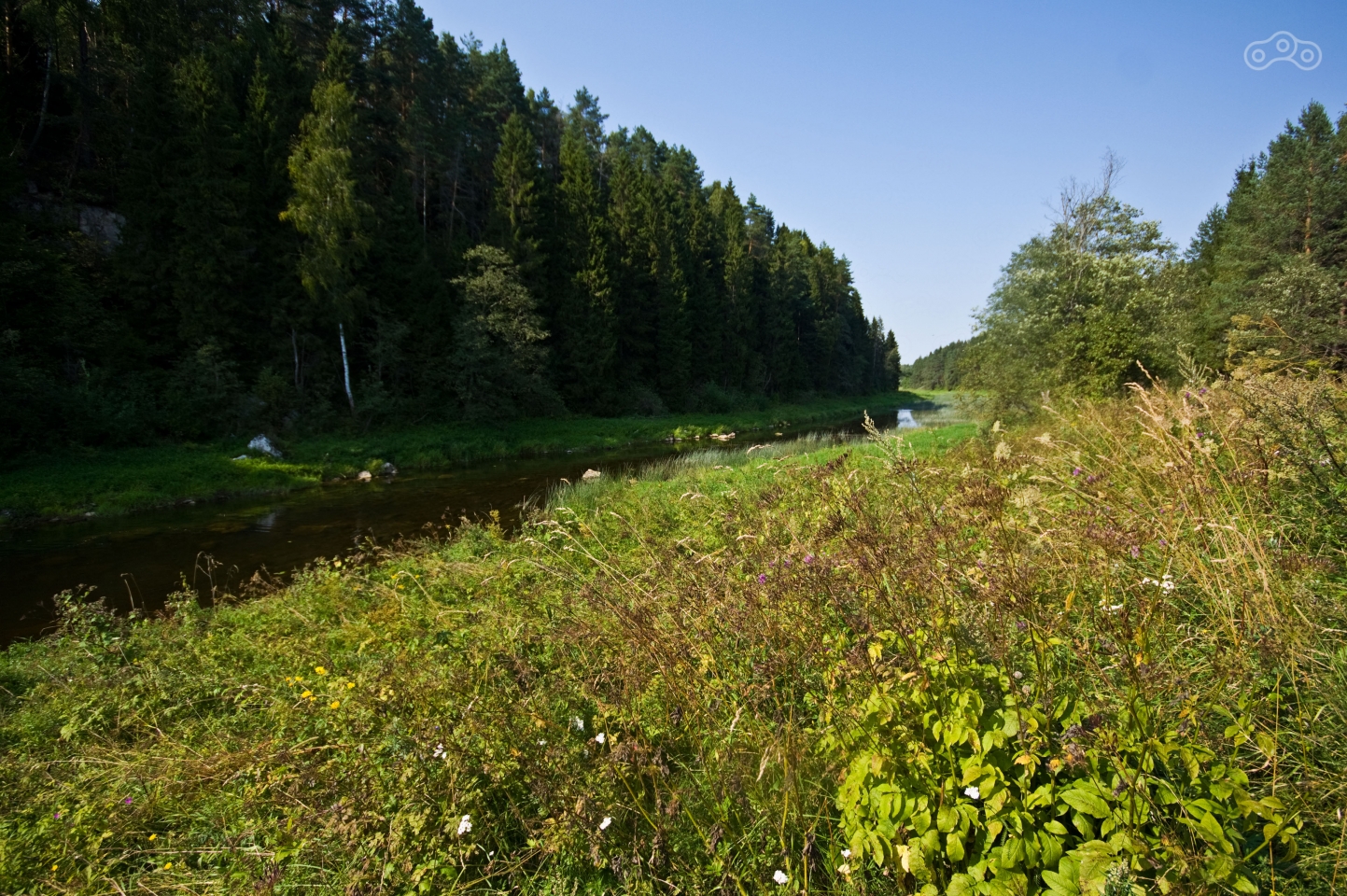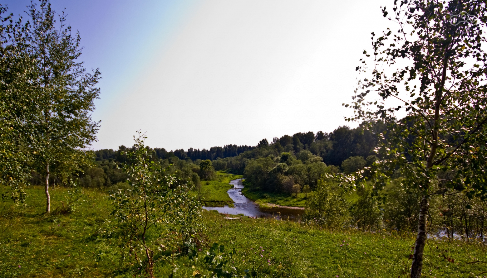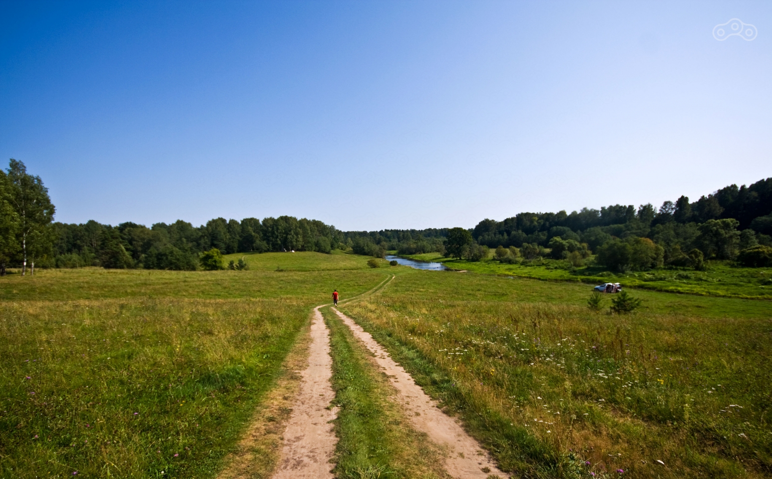 Поев, я продолжил путь в сторону Зубцова. Дорога вывела прямо в город, и в самом городе качество дорог оказалось ещё хуже, чем за его границами. Кое-как проехав через эти ямы, именуемые дорогами, я вышел на второстепенную довольно качественную дорогу и помчался вдоль реки Волга. После Мозгово я свернул на грунтовку через поле и приехал на то место, где бывал уже несколько лет назад – обрыв над рекой Дёржа. Наверху стояли две машины, а вниз вёл довольно крутой испещрённый корнями спуск, по которому я в прошлый раз съехать не рискнул. Однако в этот раз спуск не показался мне чем-то сложным. В горах Кавказа я ездил дорожки и покруче. Я спустился вниз и доехал до реки. Там в воде плескались две компании, судя по разговорам одна с Украины, другая из Москвы. Жара стояла неимоверная, стоять на месте в экипировке было откровенно тяжело. Я намочил в водах реки свой баф, повязал его на шею и полез обратно наверх. Подъём тоже не показался сложным, благо износившийся в дальняке задний баллон я уже переобул. Я прокатился вдоль реки по накатанным грунтовым колеям, но как и в прошлый раз дорога внезапно кончилась посреди поля. Фрирайдить не хотелось, да и резина у меня не самая удачная для езды по пашне, так что я вернулся в Мозгово и не доезжая до Зубцова вышел на трассу М9 в сторону дома.